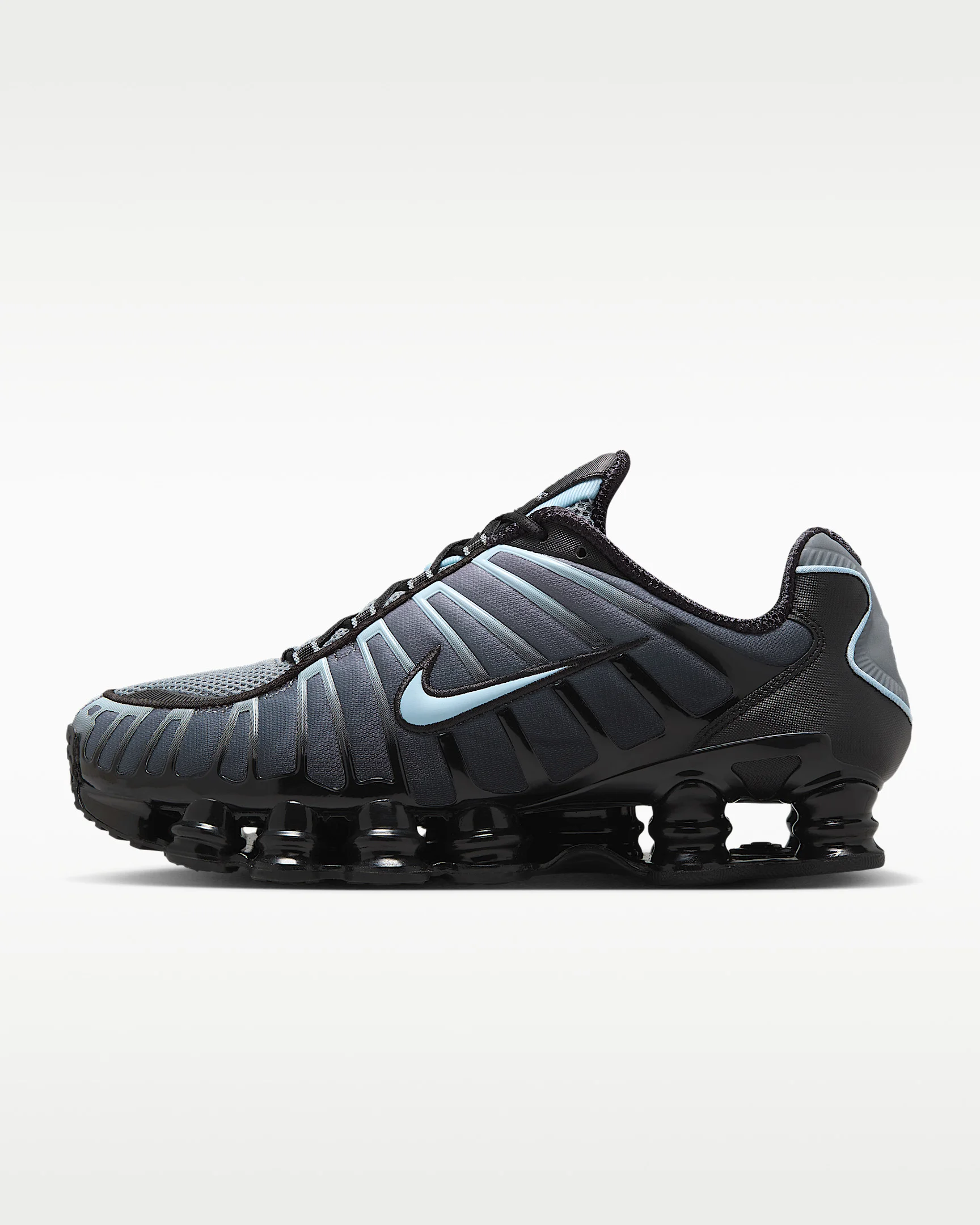 The Nike Shox TL takes mechanical cushioning to the next level. A recrafted version of the 2003 icon, it features breathable mesh and full-length Nike Shox technology for optimal impact absorption and a bold look. Benefits - Nike Shox technology combines resilient, flexible columns with moderator plates for outstanding cushioning that compresses and regains its shape. - Combination upper with full TPU cage is near-exact replica of the 2003 Nike Shox TL. - Molded overlays throughout midfoot provide support and snug fit. - TPU plate in the heel between the foam midsole and Nike Shox technology helps provide lateral stability and support. Product Details - Rubber outsole - Reflective details - Not intended for use as Personal Protective Equipment (PPE) - Shown: Black/Cool Grey/Celestine Blue - Style: IF6202-002