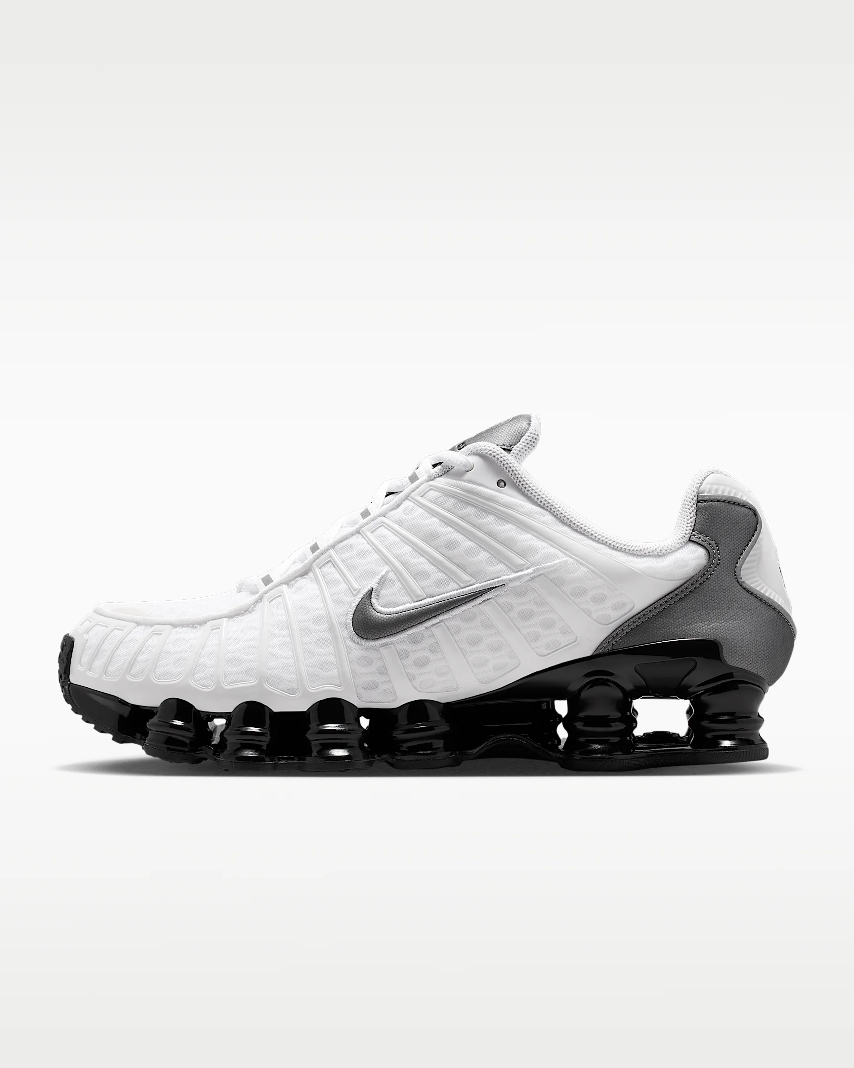 The Nike Shox TL takes mechanical cushioning to the next level. A recrafted version of the 2003 icon, it features breathable mesh in the upper and full-length Nike Shox technology for optimal impact absorption and a bold look on the streets. Benefits - Nike Shox technology combines resilient, flexible columns with moderator plates for outstanding cushioning that compresses and regains its shape. - Combination upper with full TPU cage is near-exact replica of the 2003 Nike Shox TL. - Molded overlays throughout midfoot provide support and snug fit. - TPU plate in heel between midsole and Nike Shox technology helps provide lateral stability and support. Product Details - Foam midsole - Rubber outsole - Shown: White/Black/Cool Grey/Metallic Cool Grey - Style: IR2005-100