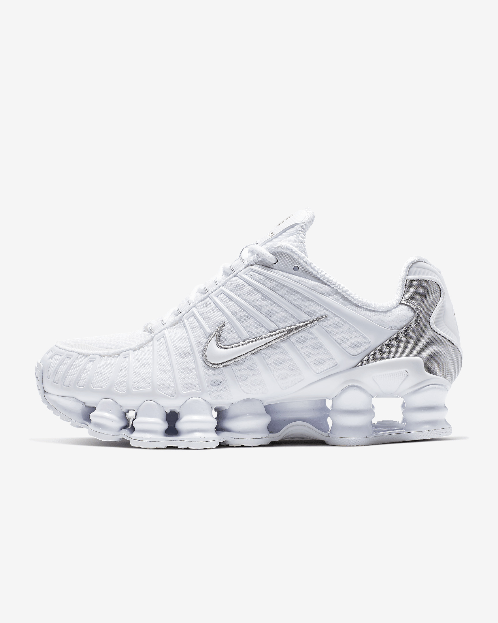 The Nike Shox TL takes mechanical cushioning to the next level. A recrafted version of the 2003 icon, it features breathable mesh in the upper and full-length Nike Shox technology for optimal impact absorption and a bold look on the streets. Benefits - Nike Shox technology combines resilient, flexible columns with moderator plates for outstanding cushioning that compresses and regains its shape. - Design is a near-exact replica of the 2003 Nike Shox TL. - Molded overlays throughout the midfoot provide support and a snug fit. - TPU plate in the heel supplies lateral stability and support. Product Details - Synthetic and textile upper - Rubber outsole - Not intended for use as Personal Protective Equipment (PPE) - Shown: White/Metallic Silver/Max Orange/White - Style: AR3566-100