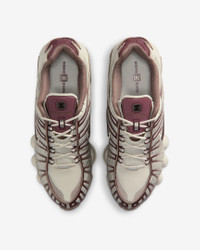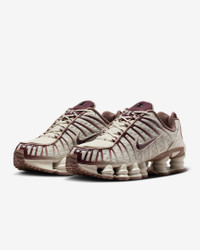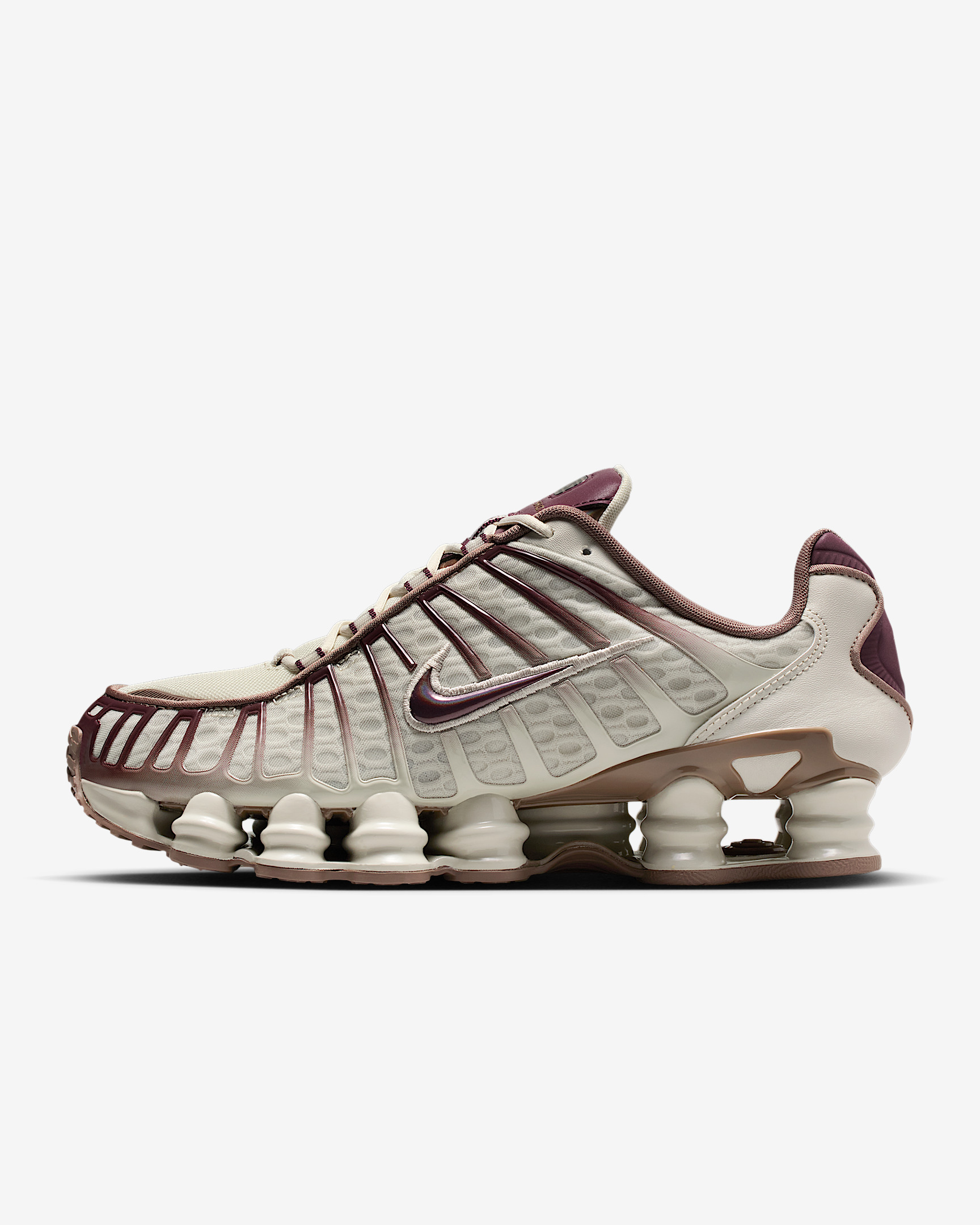 The Nike Shox TL takes mechanical cushioning to the next level. A recrafted version of the 2003 icon, it features breathable mesh in the upper and full-length Nike Shox technology for optimal impact absorption and a bold look on the streets. Benefits - Nike Shox technology combines resilient, flexible columns with moderator plates for outstanding cushioning that compresses and regains its shape. - Combination upper with full TPU cage is near-exact replica of the 2003 Nike Shox TL. - Molded overlays throughout midfoot provide support and snug fit. - TPU plate in heel between midsole and Nike Shox technology helps provide lateral stability and support. Product Details - Foam midsole - Rubber outsole - Shown: Light Bone/Mink Brown/Burgundy Crush - Style: IM6013-072