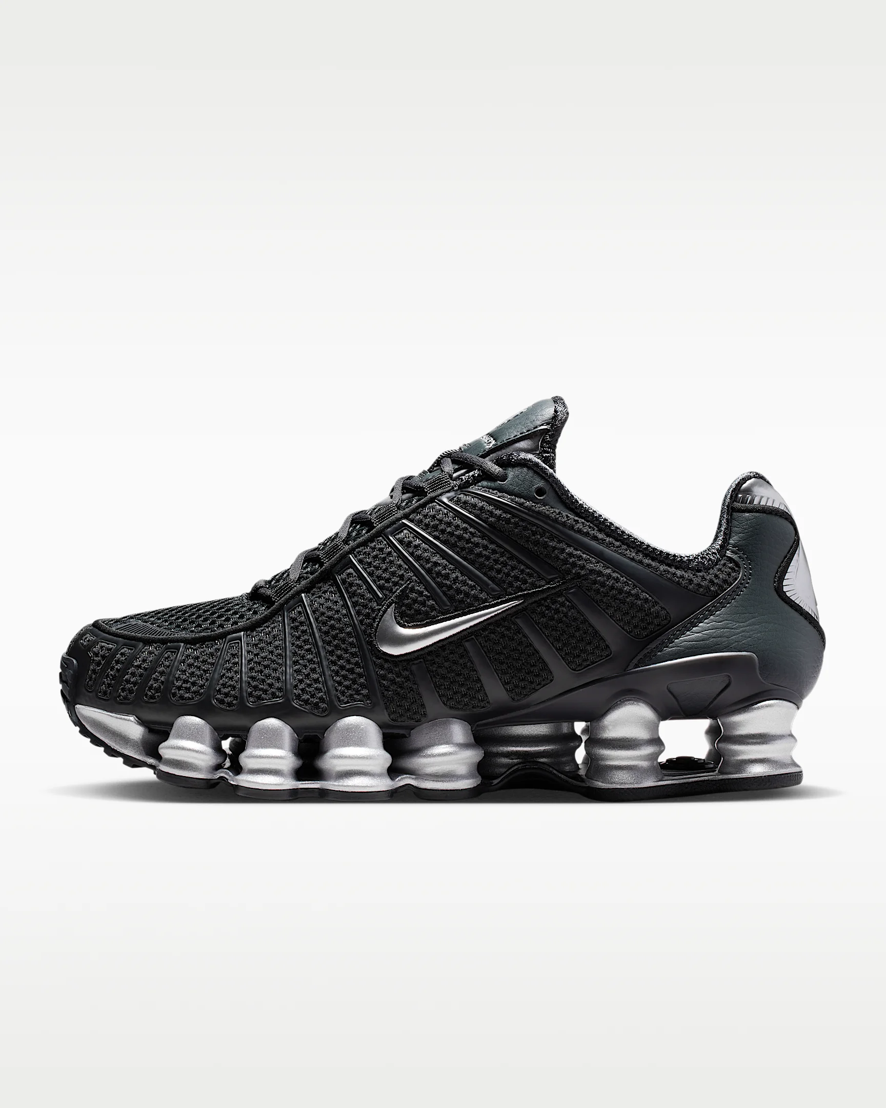 The Nike Shox TL takes mechanical cushioning to the next level. A recrafted version of the 2003 icon, it features breathable mesh in the upper and full-length Nike Shox technology for optimal impact absorption and a bold look on the streets. Benefits - Nike Shox technology combines resilient, flexible columns with moderator plates for outstanding cushioning that compresses and regains its shape. - Combination upper with full TPU cage is near-exact replica of the 2003 Nike Shox TL. - Molded overlays throughout midfoot provide support and snug fit. - TPU plate in heel between midsole and Nike Shox technology helps provide lateral stability and support. Product Details - Foam midsole - Rubber outsole - Shown: Off Noir/Black/Metallic Silver - Style: IH2559-001