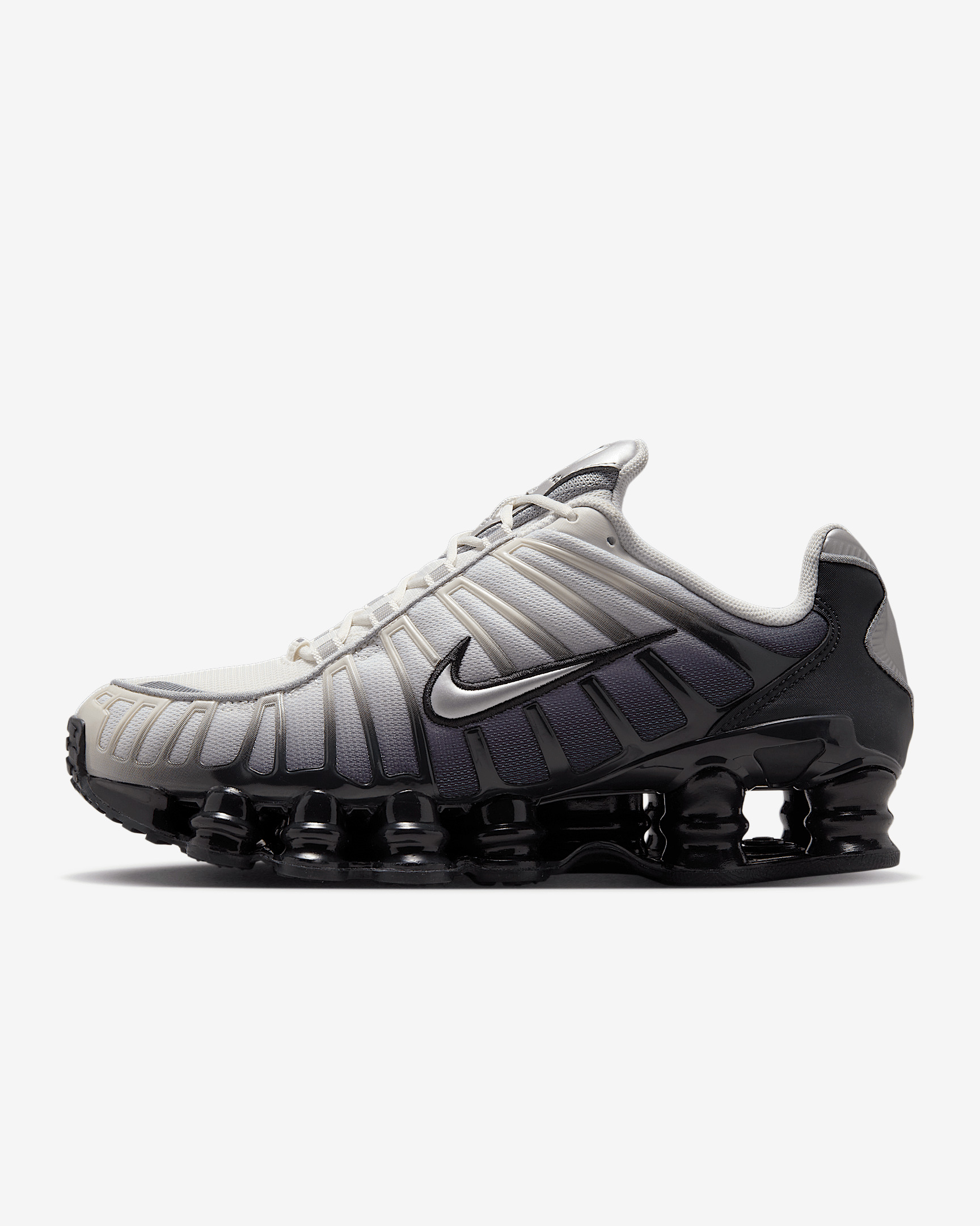 The Nike Shox TL takes mechanical cushioning to the next level. A recrafted version of the 2003 icon, this edition features breathable mesh and full-length Nike Shox technology to give you both optimal impact absorption and a bold look. Benefits - Nike Shox technology combines resilient, flexible columns with moderator plates for outstanding cushioning that compresses and regains its shape. - Combination upper with full TPU cage is near-exact replica of the 2003 Nike Shox TL. - Molded overlays throughout midfoot provide support and snug fit. - TPU plate in heel between the foam midsole and Nike Shox technology helps provide lateral stability and support. Product Details - Shown: Off Noir/Phantom/Metallic Silver - Style: IB7705-001