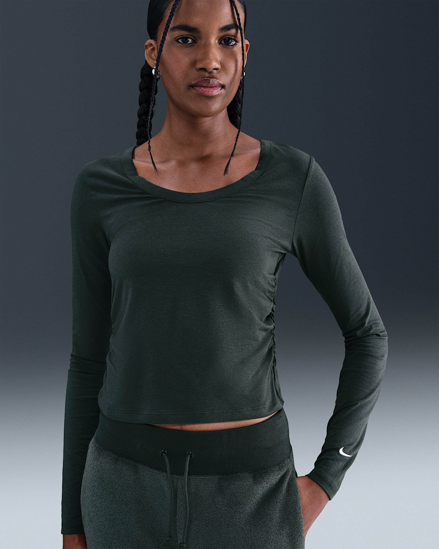 Ruched sides elevate this simple top. It's made with smooth jersey fabric that's stretchy with a slight drape, making it perfect for everyday wear. Product Details - 48% modal/46% cotton/6% spandex - Swoosh logo at center chest - Machine wash - Imported - Shown: Seaweed/Sail - Style: HV2399-390 SIZE & FIT Model is wearing size S and is 5′10″178cm Tight fit: snug and form-fitting