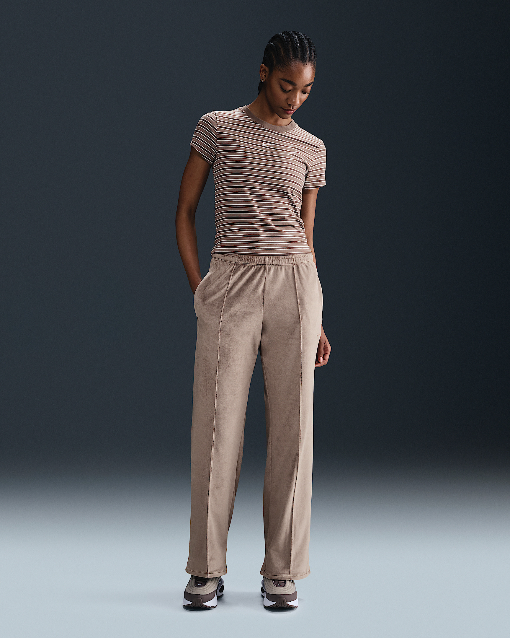 Soft as can be, these midweight velour pants have a nice drape and a good amount of stretch. The straight-leg, tailored fit helps keep the cozy look elevated. Product Details - 93% polyester/7% spandex - Pockets - Raised seams down legs - Embroidered Swoosh logo on left thigh - Machine wash - Imported - Shown: Mink Brown/Mink Brown - Style: HJ0922-233 SIZE & FIT Model is wearing size S and is 5′9″175cm Standard fit: easy and traditional Fl length: hits below ankle
