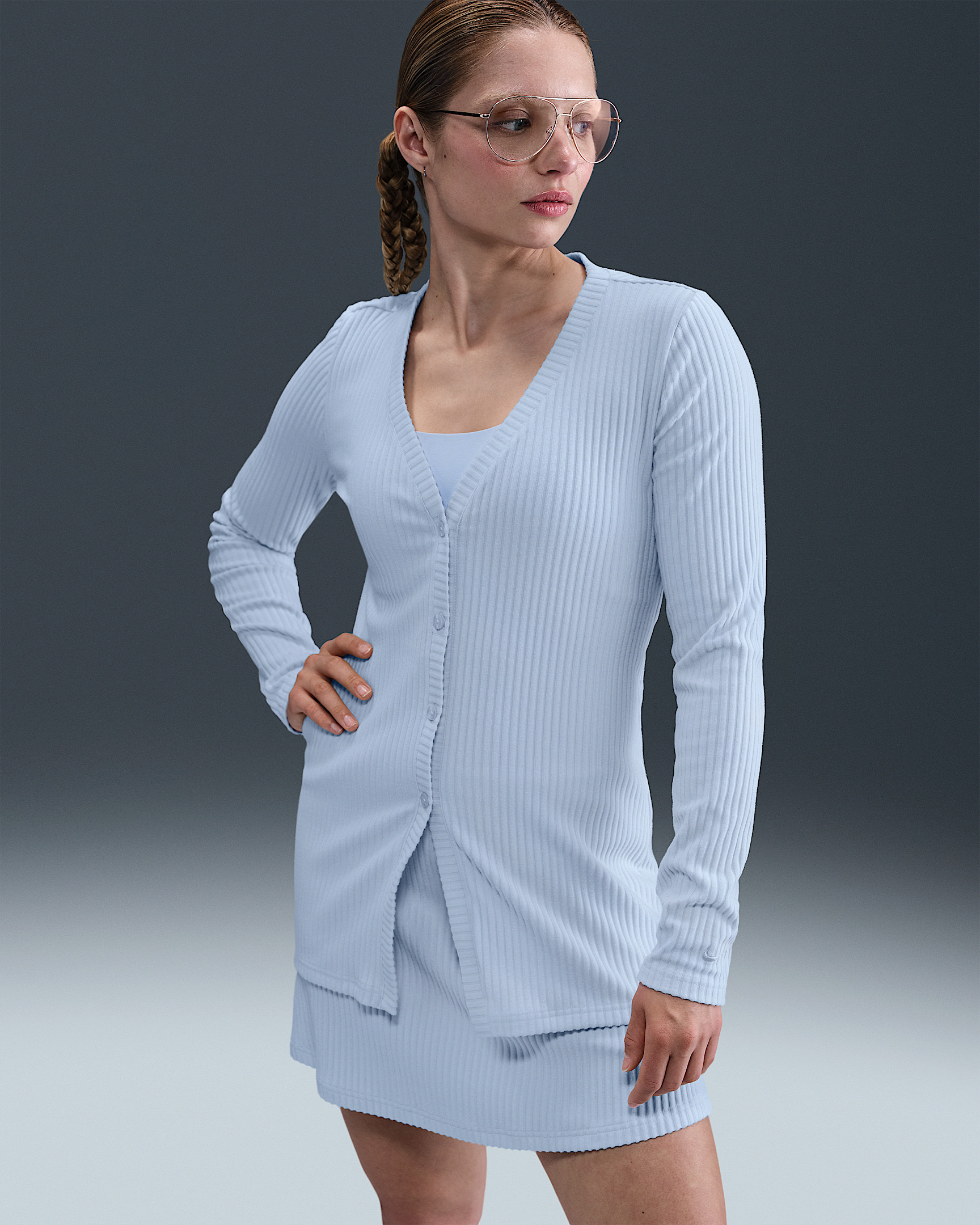 Elevate your look with this elongated cardigan. Ribbed jersey fabric enhances this piece with visible texture while giving you a super soft and comfortable feel. Product Details - 33% rayon/32% acrylic/31% cotton/4% spandex - Button closure - Embroidered Swoosh logo on left cuff - Machine wash - Imported - Shown: Blue Tint/Blue Tint - Style: HJ1242-423 SIZE & FIT Model is wearing size S and is 5′10″178cm Sm fit: sleek and tailored