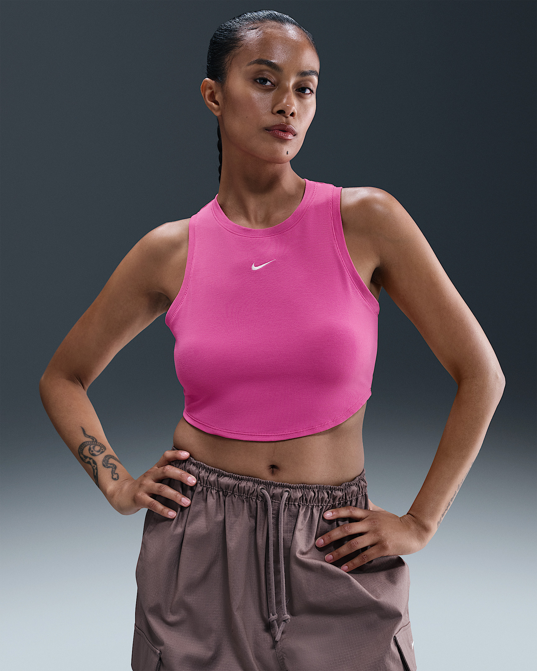 Grounded in style, comfort and versatility, meet our new luxury loungewear. With a cropped fit that hits near the waist, this tank is made from our soft mini-ribbed jersey is stretchy with a slight drape, making it perfect for everyday wear. So wear it around the clock and all through the calendar. Product Details - Curved hem - Embroidered Swoosh logo - 61% polyester/30% lyocell/9% spandex - Machine wash - Imported - Shown: Playful Pink/Sail - Style: FB8279-675 SIZE & FIT Model is wearing size S and is 5′8″173cm Tight fit: snug and form-fitting