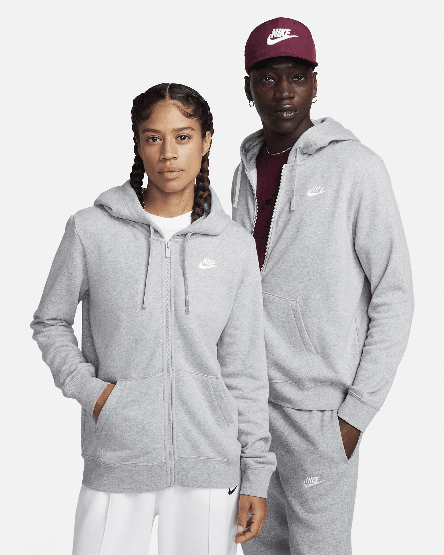 Club Fleece sweatshirts, universally loved for their coziness and consistency, are for everyone. Always soft and made with a relaxed fit, they’re basics that help you do more. This full-zip option allows you to regulate your temp on the fly. Zip it up when the wind is howling or leave it open to show off your favorite tees and tops. Benefits - Our best-selling fleece for a reason, Club Fleece has a cozy, familiar feel and consistent fit you can return to again and again. Brushed for added warmth and softness, it’s an ideal layer for colder temperatures. - Ribbing at the hem and cuffs is soft and stretchy for easy layering. - Jersey-lined 3-panel hood feels soft and smooth. Product Details - Body: 80% cotton/20% polyester. Hood Lining: 100% cotton. - Embroidered Futura logo - Flat drawcord - Front pocket - Machine wash - Imported - Shown: Dark Grey Heather/White - Style: DQ5471-063 SIZE & FIT Model is wearing size S and is 6′3″189cm Standard fit: easy and traditional