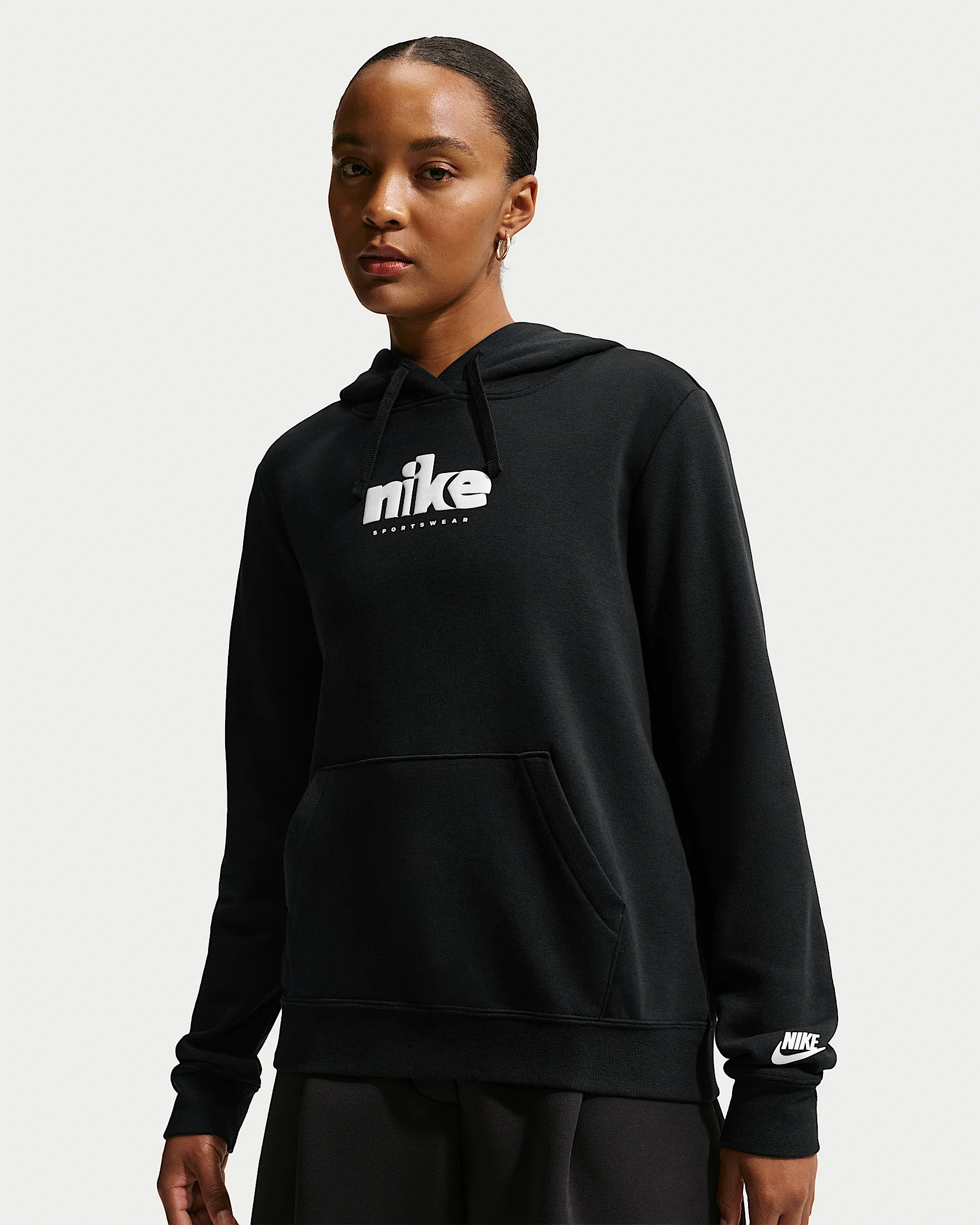 Meet the comfort of Club. This sweatshirt is made with midweight semi-brushed fleece that's slightly fuzzy on the inside and smooth on the outside. Its relaxed fit gives it a clean yet cozy look. Product Details - Hood with drawcord - Pouch pocket - Ribbed hem and cuffs - Body: 80% cotton/20% polyester. Hood lining: 100% cotton. - Machine wash - Imported - Shown: Black/White - Style: IF0226-010 SIZE & FIT Model is wearing size S and is 5′7″170cm Standard fit: easy and traditional
