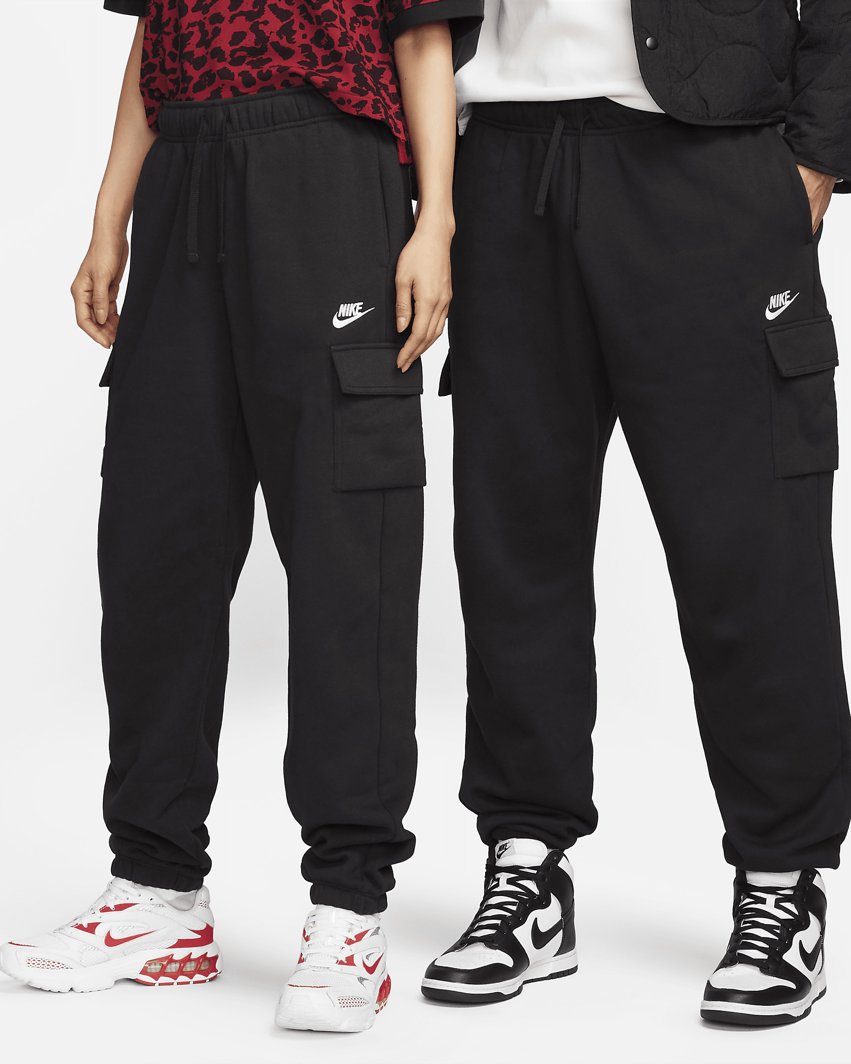 Club Fleece, universally loved for its coziness and consistency, is for everyone. With a longer, extra-roomy leg, these mid-rise pants are the perfect fit for your favorite fitted tops and hoodies. Cargo pockets add storage for your daily essentials. Benefits - Our best-selling fleece for a reason, Club Fleece has a cozy, familiar feel and consistent fit you can return to again and again. Brushed for added warmth and softness, it’s an ideal layer for colder temperatures. - Elastic cuffs help the fabric gather for a relaxed look that still lets your shoes shine. Product Details - 80% cotton/20% polyester - Embroidered Futura logo - Flat drawcord and elastic waist - Machine wash - Imported - Shown: Black/White - Style: DQ5196-010 SIZE & FIT Female model is wearing size S and is 5'10"178cm Male model is wearing size L and is 6'2"188cm Oversized fit: exaggerated and spacious Fl length: hits below ankle Fits large; we recommend ordering a size down