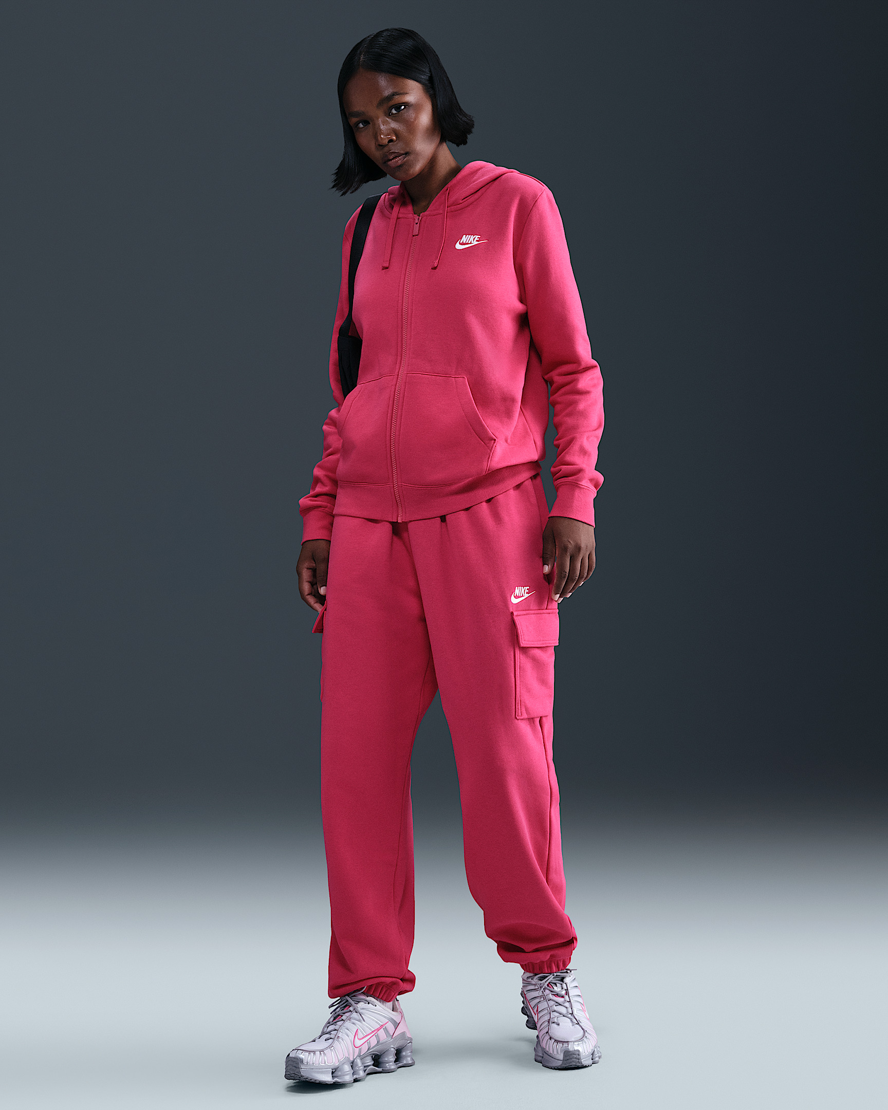 Club Fleece, universally loved for its coziness and consistency, is for everyone. With a longer, extra-roomy leg, these mid-rise pants are the perfect fit for your favorite fitted tops and hoodies. Cargo pockets add storage for your daily essentials. Benefits - Our best-selling fleece for a reason, Club Fleece has a cozy, familiar feel and consistent fit you can return to again and again. Brushed for added warmth and softness, it’s an ideal layer for colder temperatures. - Elastic cuffs help the fabric gather for a relaxed look that still lets your shoes shine. Product Details - 80% cotton/20% polyester - Embroidered Futura logo - Flat drawcord and elastic waist - Machine wash - Imported - Shown: Rush Pink/White - Style: DQ5196-666 SIZE & FIT Model is wearing size S and is 5′7″170cm Oversized fit: exaggerated and spacious Fl length: hits below ankle Fits large; we recommend ordering a size down