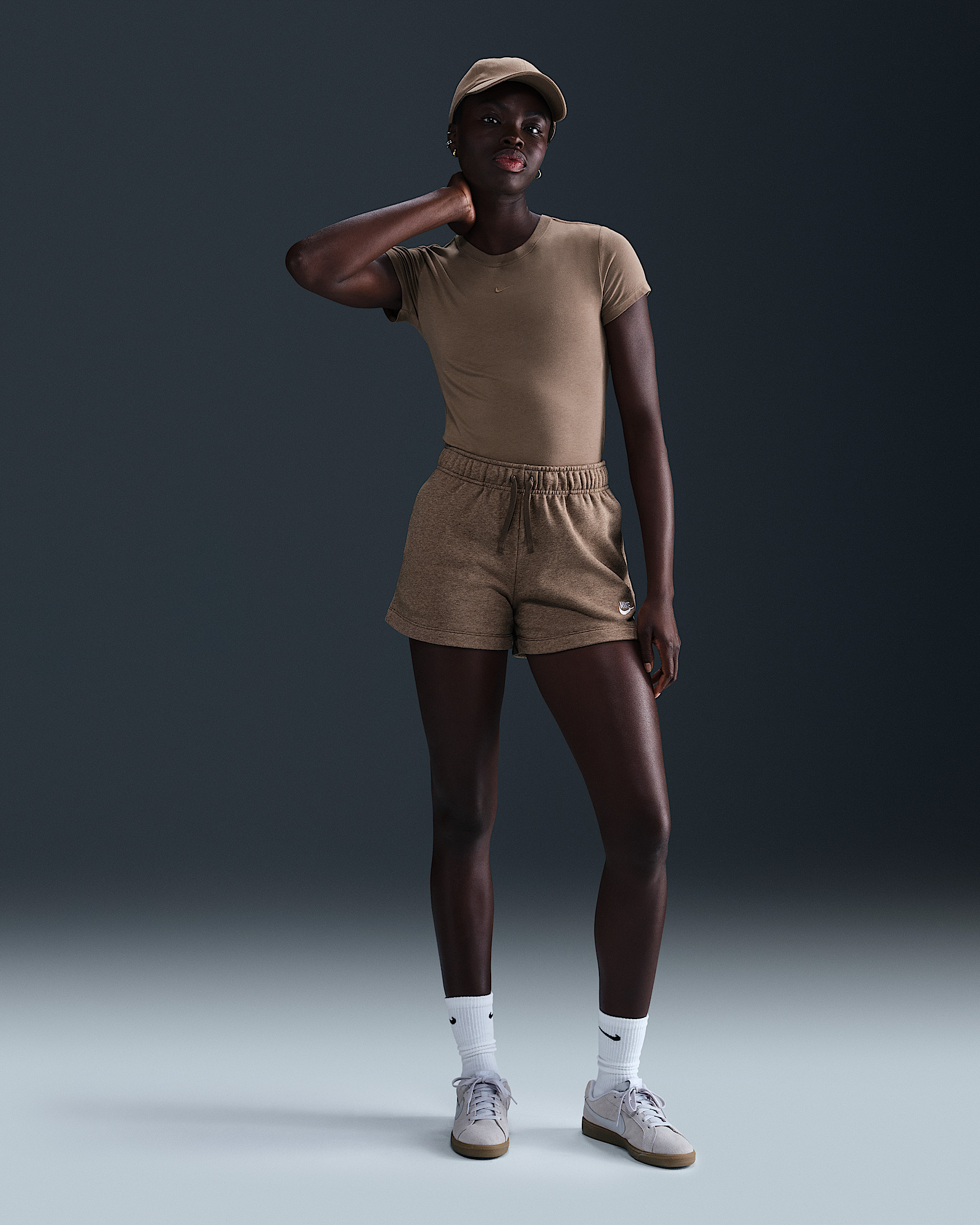 Club Fleece, universally loved for its coziness and consistency, is for everyone. Designed to meet your favorite crop tops at their hem, these relaxed, mid-rise Club Fleece shorts have a supersoft feel that makes it easy to stay comfortable. Benefits - Our best-selling fleece for a reason, Club Fleece has a cozy, familiar feel and consistent fit you can return to again and again. Brushed for added warmth and softness, it’s an ideal layer for colder temperatures. - Pockets provide quick storage for keys, phone and cold hands. Product Details - Body: 80% cotton/20% polyester. Pocket Bag Knuckle Side: 100% cotton. - Mid-rise waistband - Embroidered Futura logo - Flat drawcord and elastic waist - Hand pockets - Machine wash - Imported - Shown: Mink Brown/Heather/White - Style: DQ5802-214 SIZE & FIT Model is wearing size S and is 5′11″180cm Standard fit: easy and traditional