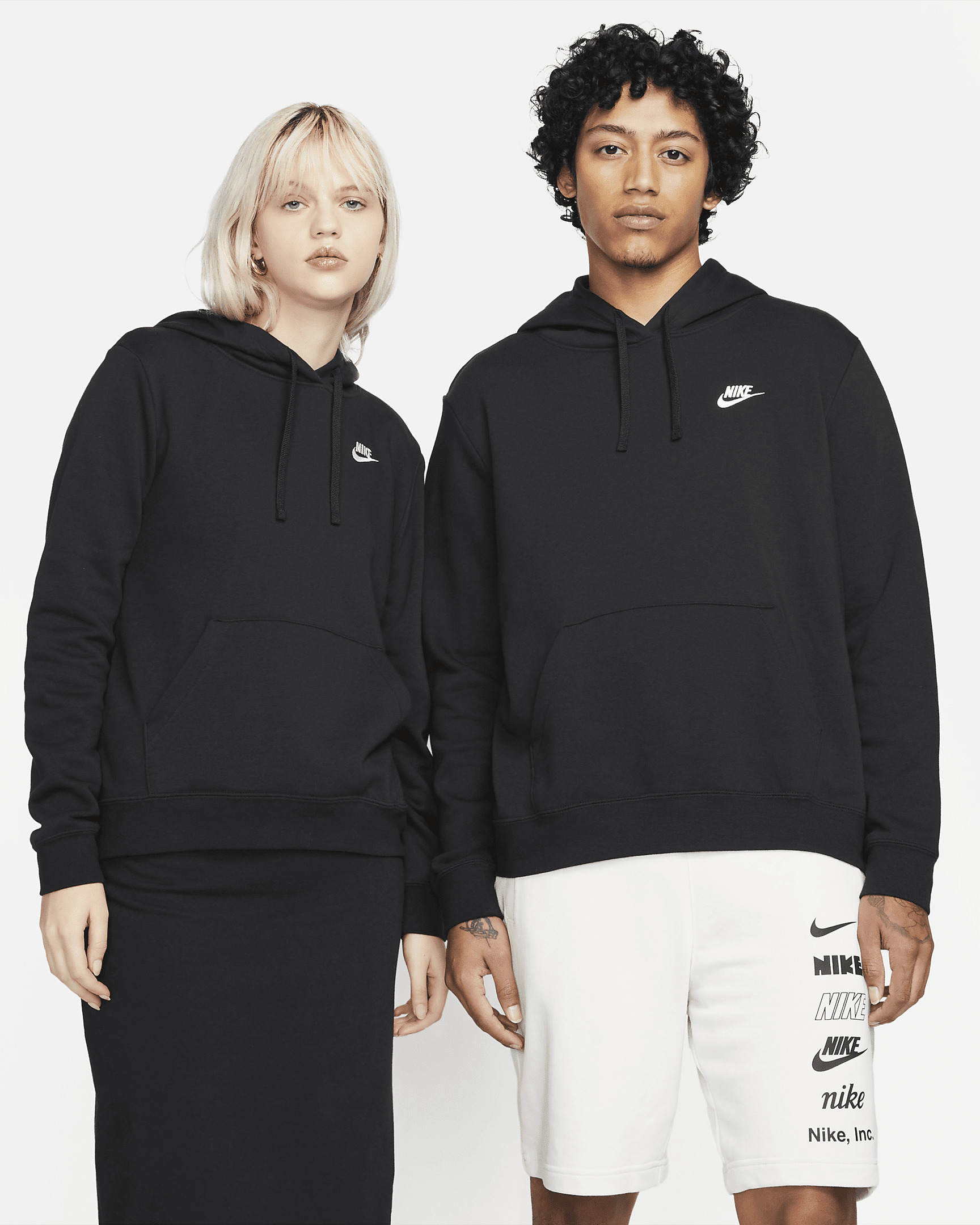 Club Fleece sweatshirts, universally loved for their coziness and consistency, are for everyone. A cold-weather essential, this easy-to-layer hoodie is a go-to whether you're pairing it with your favorite jacket or wearing it around the house. Benefits - Our best-selling fleece for a reason, Club Fleece has a cozy, familiar feel and consistent fit you can return to again and again. Brushed for added warmth and softness, it’s an ideal layer for colder temperatures. - Ribbed cuffs and hem help keep the hoodie in place while you move. - Jersey-lined 3-panel hood feels soft and smooth. Product Details - Body: 80% cotton/20% polyester. Hood Lining: 100% cotton. - Embroidered Futura logo - Machine wash - Imported - Shown: Black/White - Style: DQ5793-010 SIZE & FIT Model is wearing size S and is 5′11″180cm Standard fit: easy and traditional