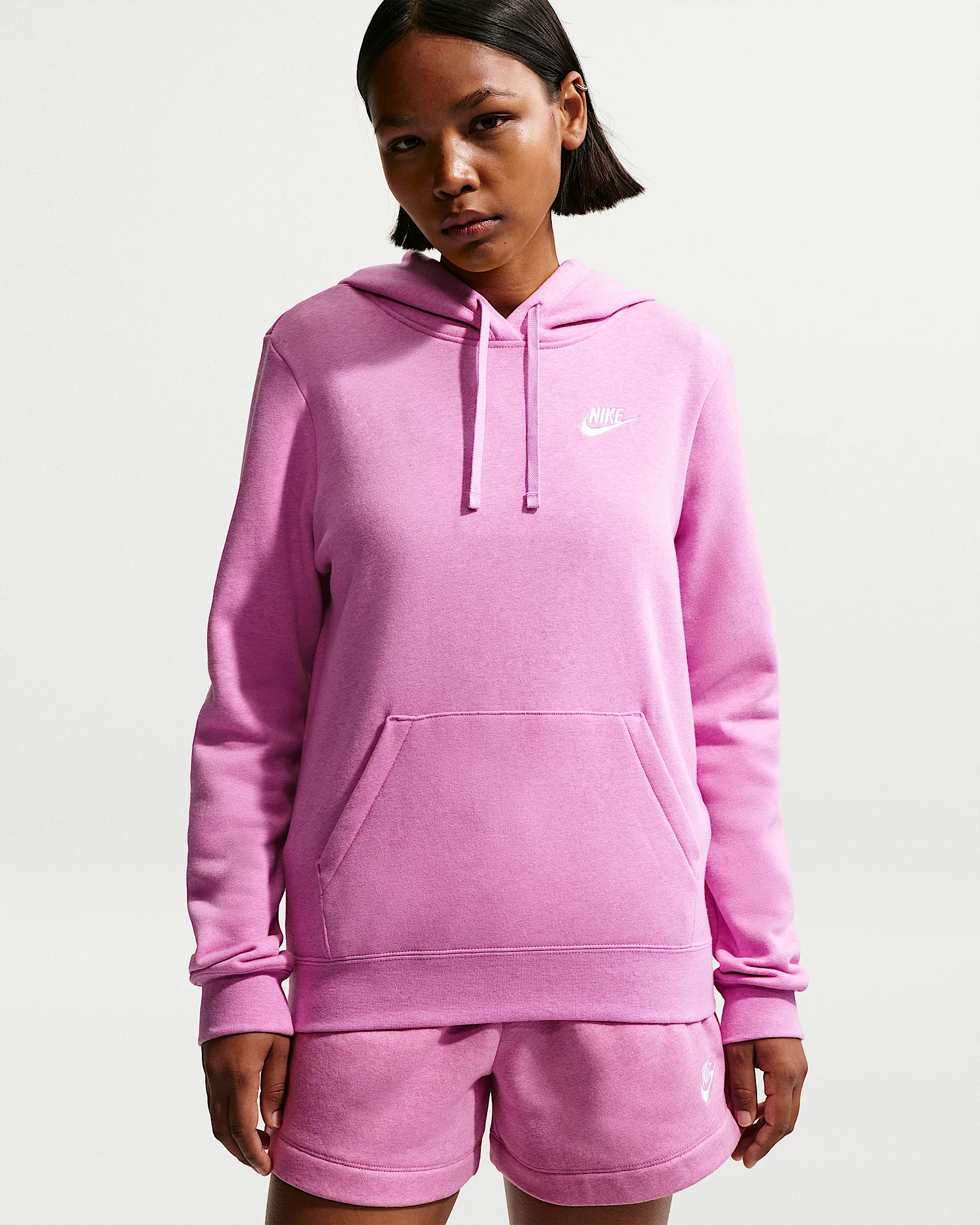 Club Fleece sweatshirts, universally loved for their coziness and consistency, are for everyone. A cold-weather essential, this easy-to-layer hoodie is a go-to whether you're pairing it with your favorite jacket or wearing it around the house. Benefits - Our best-selling fleece for a reason, Club Fleece has a cozy, familiar feel and consistent fit you can return to again and again. Brushed for added warmth and softness, it’s an ideal layer for colder temperatures. - Ribbed cuffs and hem help keep the hoodie in place while you move. - Jersey-lined 3-panel hood feels soft and smooth. Product Details - Body: 80% cotton/20% polyester. Hood Lining: 100% cotton. - Embroidered Futura logo - Machine wash - Imported - Shown: Light Magenta/Heather/White - Style: DQ5793-504 SIZE & FIT Model is wearing size S and is 5′7″170cm Standard fit: easy and traditional