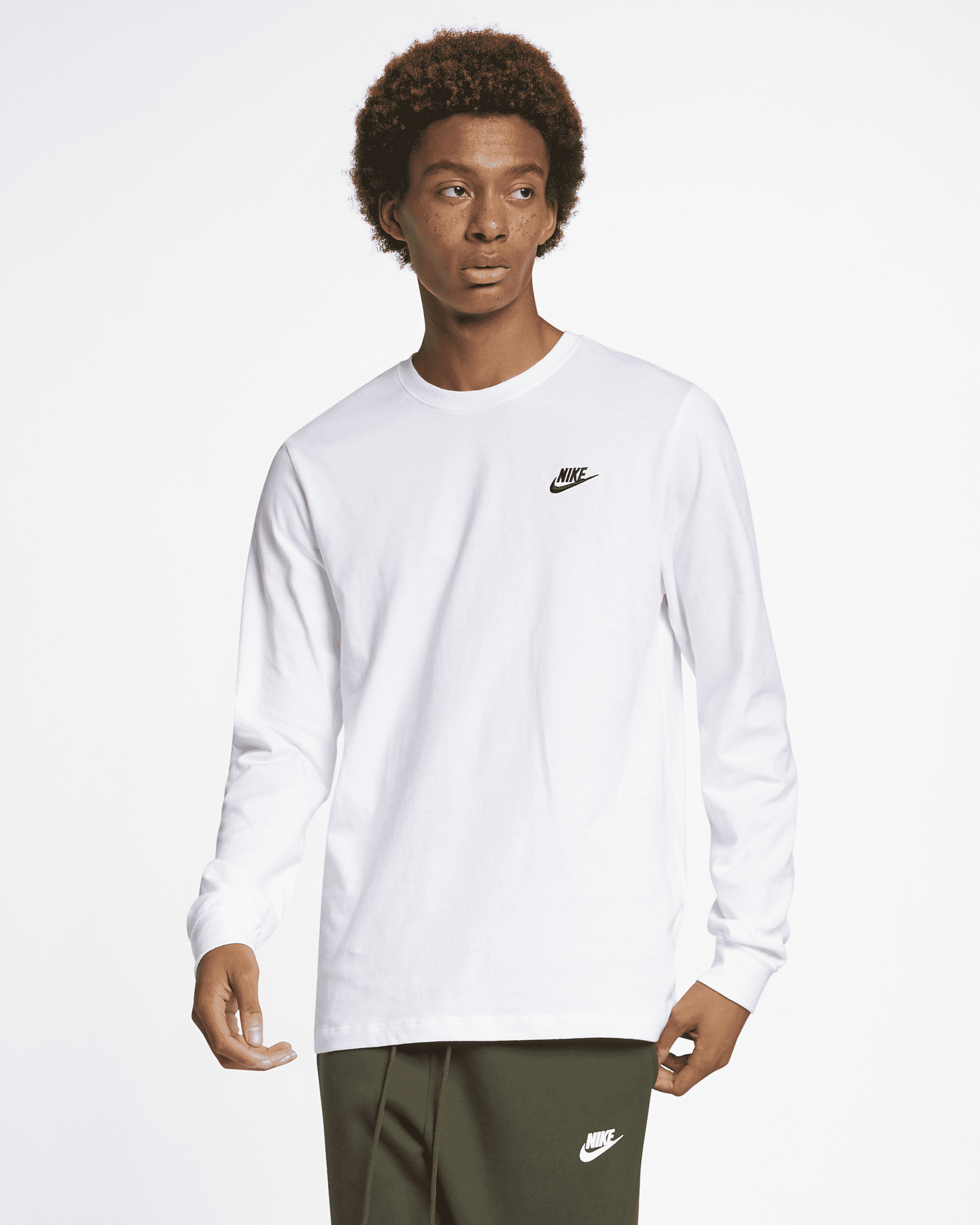 The Nike Sportswear T-Shirt sets you up with a soft cotton jersey feel and Nike's signature logo embroidered on the chest. Benefits - Mid-weight cotton fabric feels soft and slightly textured. - A relaxed fit with slightly dropped shoulders gives you a casual look, perfect for everyday wear. - Soft ribbing on the cuffs and collar add comfort and durability. Product Details - Standard fit for a relaxed, easy feel - Embroidered Nike corporate logo on chest - Fabric: 100% cotton - Machine wash - Imported - Shown: White/Black - Style: AR5193-100 SIZE & FIT Big & Tall model is wearing size 2XL and is 6'5"196cm Standard fit: easy and traditional