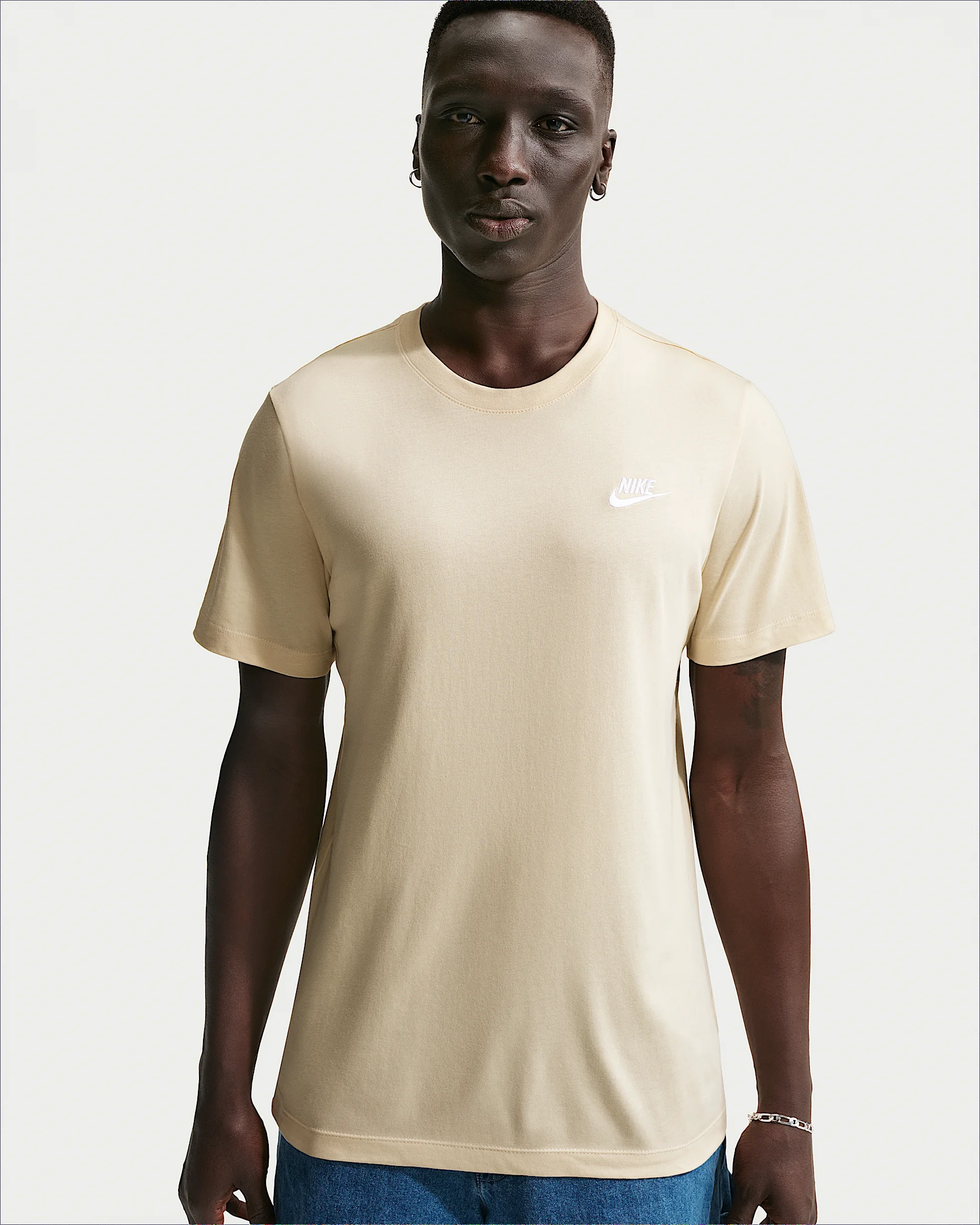 The Nike Sportswear Club T-Shirt is made with our everyday cotton fabric and a classic fit for a familiar feel right out of the bag. An embroidered Futura logo on the chest provides a signature Nike look. Benefits - The classic fit tee silhouette is relaxed through the body and hips. - Everyday cotton fabric feels soft and lightweight. Product Details - Standard fit for a relaxed, easy feel - Fabric: 100% cotton - Machine wash - Imported - Shown: Light Khaki - Style: AR4997-229 SIZE & FIT Model is wearing size M and is 6′0″183cm Standard fit: easy and traditional