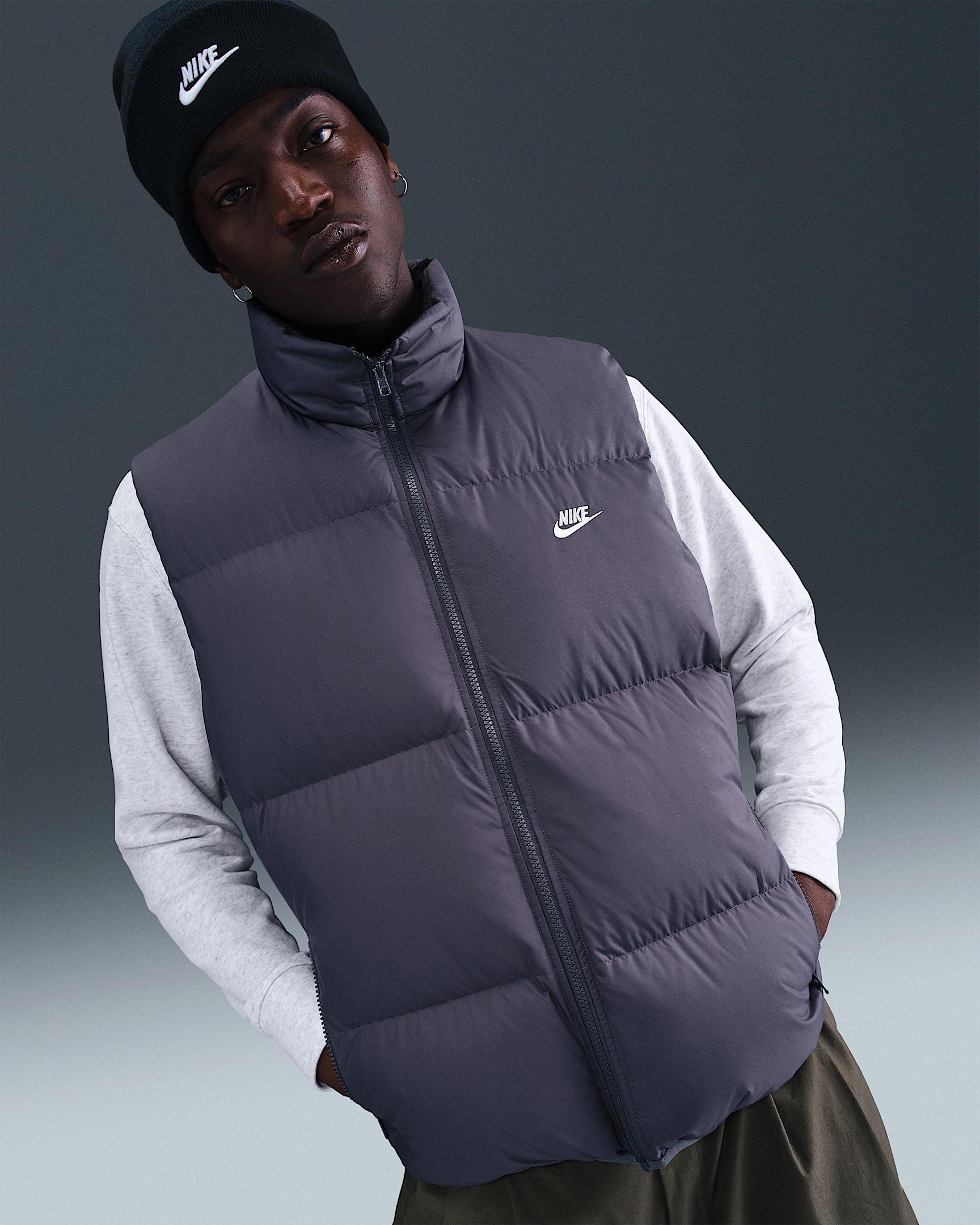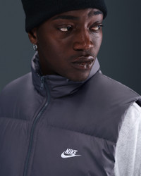 This woven vest is crafted with smooth, water-repellant fabric and Therma-FIT tech to help you stay warm and dry. The loose fit is roomy through the body, making it easy to layer without feeling too bulky. Benefits - Nike Therma fabric helps keep you warm. - Down insulation adds warmth for a lightweight construction that packs in the heat. Product Details - Embroidered Nike Futura logo - Zippered hand pockets - Body: 100% polyester; Lining: 100% polyester; Fill: duck down (Minimum 85% down)/(APA version: 85% duck down/15% feathers) - Machine wash - Imported - Shown: Iron Grey/White - Style: IB2977-068 SIZE & FIT Model is wearing size M and is 6′3″189cm Loose fit: roomy and relaxed