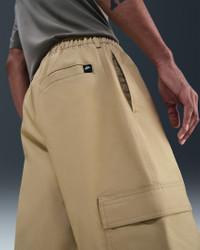 Made for everyday wear, these woven cargo pants add Nike Club comfort to a classic utility style. They're roomy through the seat and thighs with a bungee at the ankle to adjust the fit around your shoes. Benefits - The loose fit feels roomy through the seat and thighs for easy movement and casual styling. - An elastic waistband and button closure deliver a comfortable fit at your waist. Product Details - Embroidered Nike Futura logo - Zipper fly - Hand pockets - Cargo pockets - 97% cotton/3% spandex. Pocket Bags: 87% polyester/13% cotton - Machine wash - Imported - Shown: Parachute Beige/White - Style: HV1433-297 SIZE & FIT Model is wearing size M and is 6′1″185cm Loose fit: roomy and relaxed