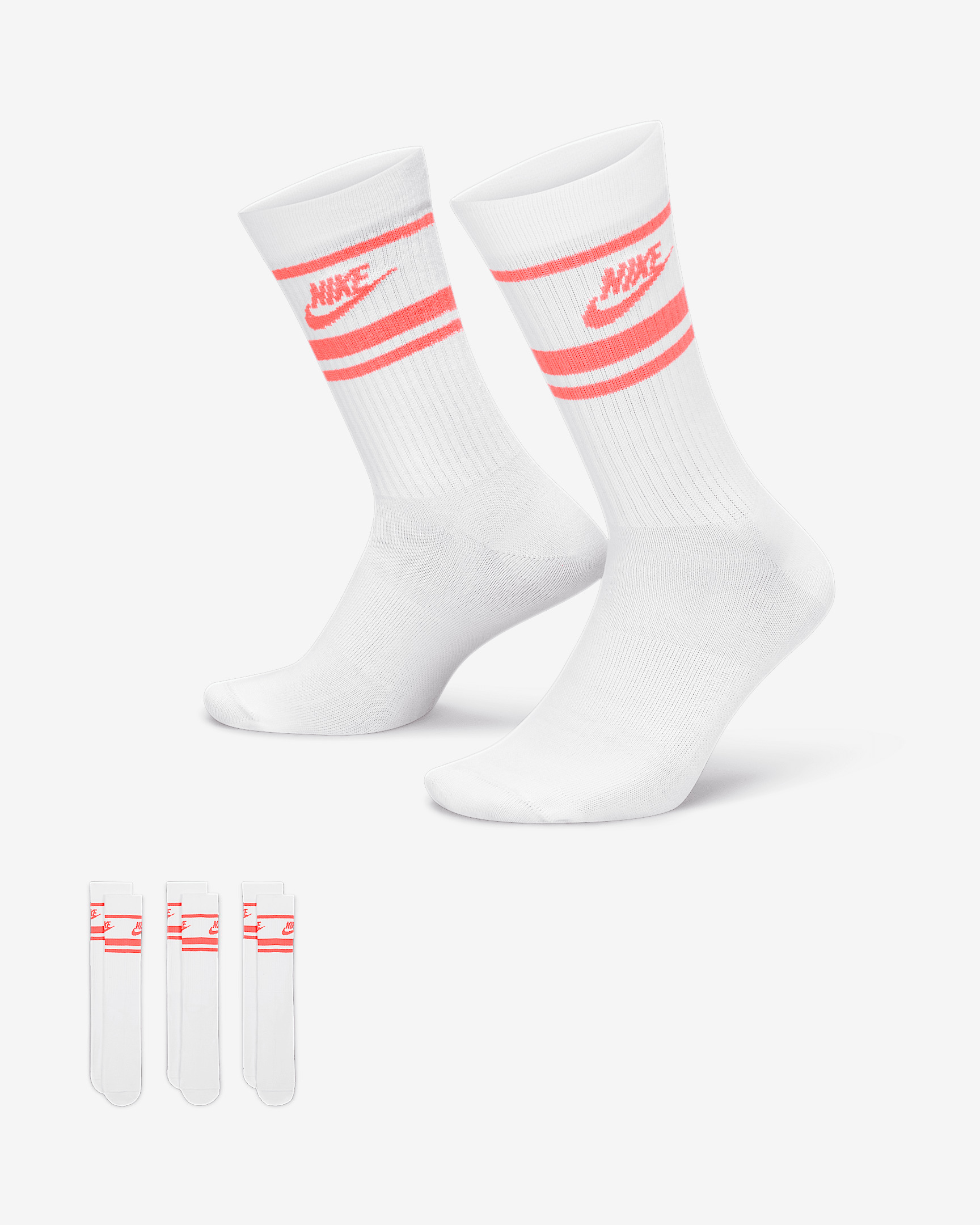 Put your best foot forward with the Nike Sportswear Socks. Made with soft, stretchy fabric and designed for daily wear, they're durable, breathable and extra comfortable. Benefits - Dri-FIT technology helps keep your feet dry and comfortable. - Reinforced heel and toe provide durability. - Strategically placed mesh adds breathability. Product Details - 97% polyester/3% polyurethane - Machine wash - Imported - Shown: White/Hot Punch/Hot Punch - Style: DX5089-100