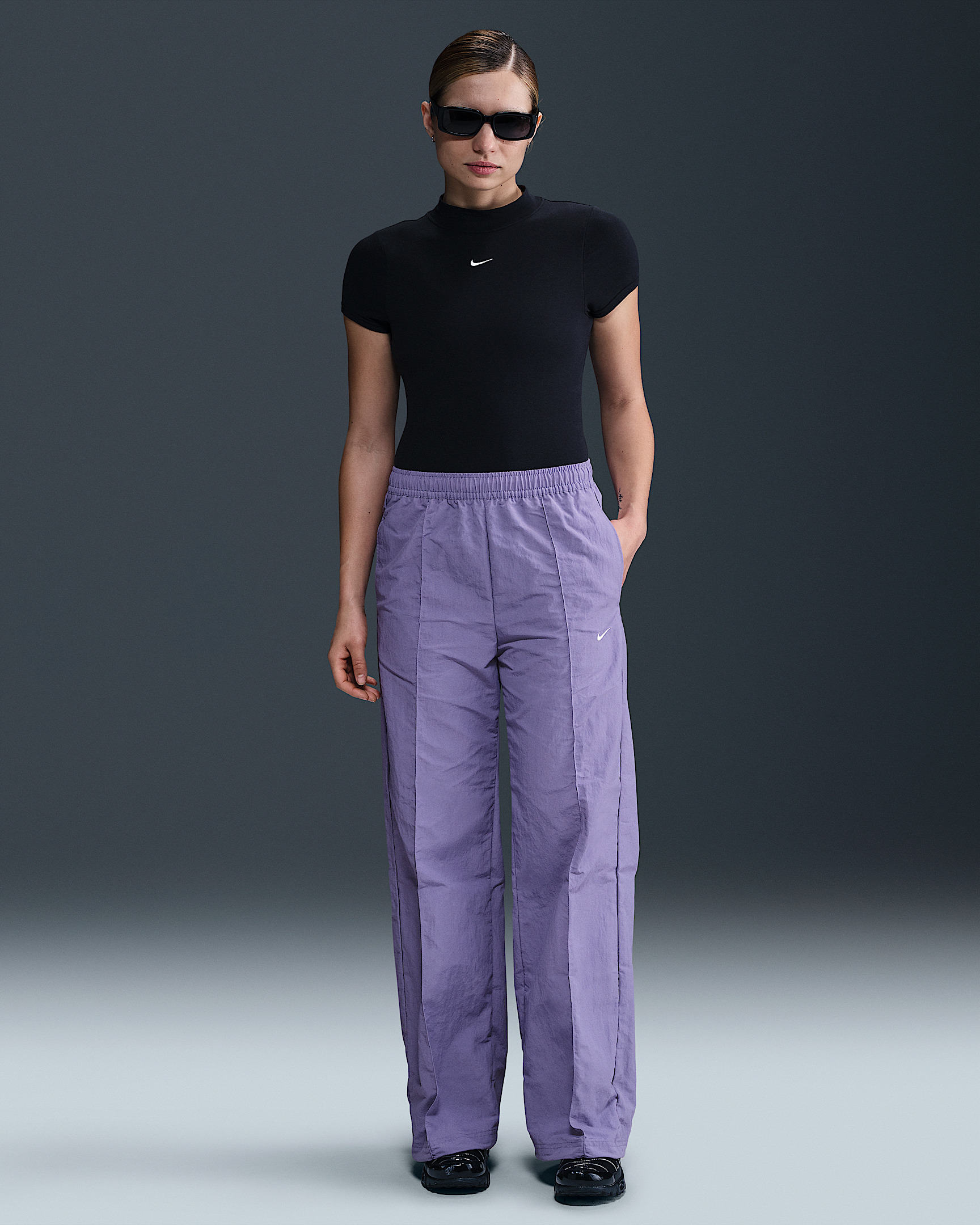 Simplicity meets functionality. These crisp, crinkled pants have everything you need for all-day wear: water-repellent fabric, multiple pockets and an adjustable design. A bungee toggle at the hem means you can tighten it for a jogger-like fit or keep it open for a relaxed look. You've got stylish options—rain or shine. Benefits - Bungee toggles let you easily adjust your fit. - Center-front pin tuck creates a tailored look. - Matte nylon fabric is light and durable with a crinkled look. - Water-repellent finish helps keep you dry in light rain. - Discreet pockets at the sides and back right store all your odds and ends. Product Details - Embroidered Swoosh logo - Elastic waistband - 100% nylon - Machine wash - Imported - Shown: Dusty Amethyst/White - Style: FQ3588-527 SIZE & FIT Model is wearing size S and is 5′10″178cm Standard fit: easy and traditional Fl length: hits below ankle