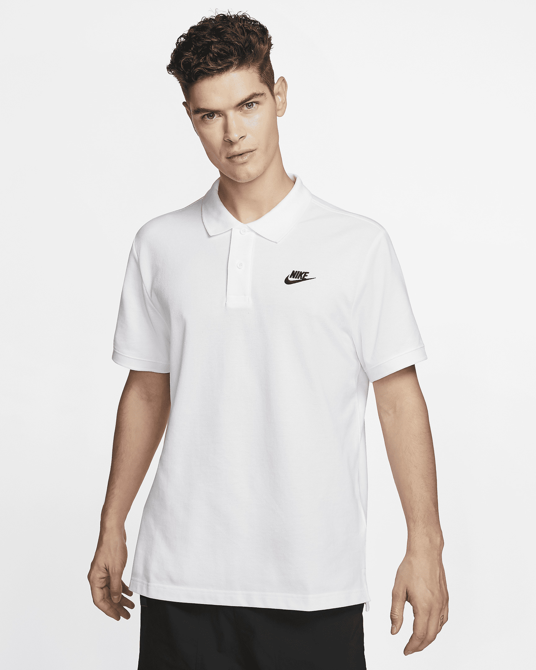 The Nike Sportswear Polo elevates a timeless style with refined details. Crafted from ultrasoft cotton, it features a fold-over collar with a 2-button placket for a classic look with a modern edge. Product Details - Side vents allow for ease of motion - Nike logo is embroidered on left chest - 100% cotton - Machine wash - Imported - Shown: White/Black - Style: CJ4456-100 SIZE & FIT Standard fit: easy and traditional