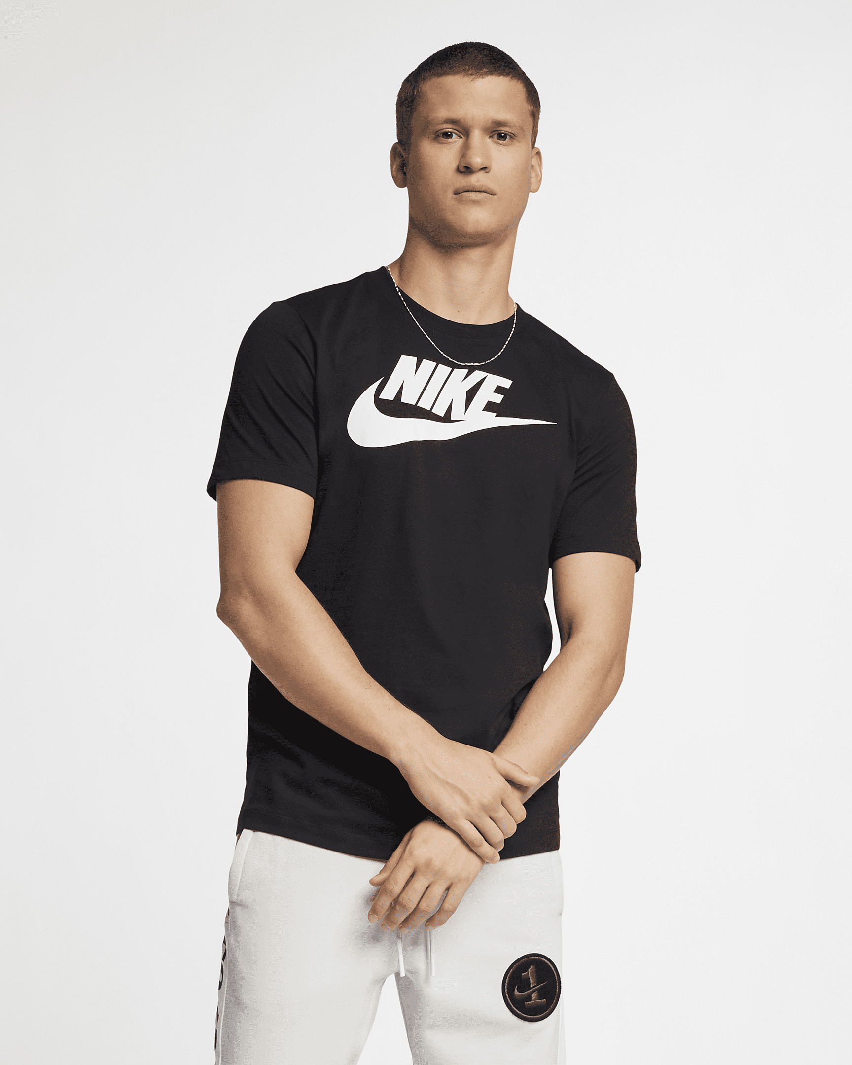 The Nike Sportswear T-Shirt sets you up with soft cotton jersey and a classic logo on the chest. Benefits - Soft fabric feels comfortable against your skin. - Lock-up logo on the chest shows your love for sport. - Ribbed crew neck is durable yet comfortable. Product Details - Standard fit for a relaxed, easy feel - 100% cotton - Machine wash - Imported - Shown: Black/White - Style: AR5004-010 SIZE & FIT Standard fit: easy and traditional