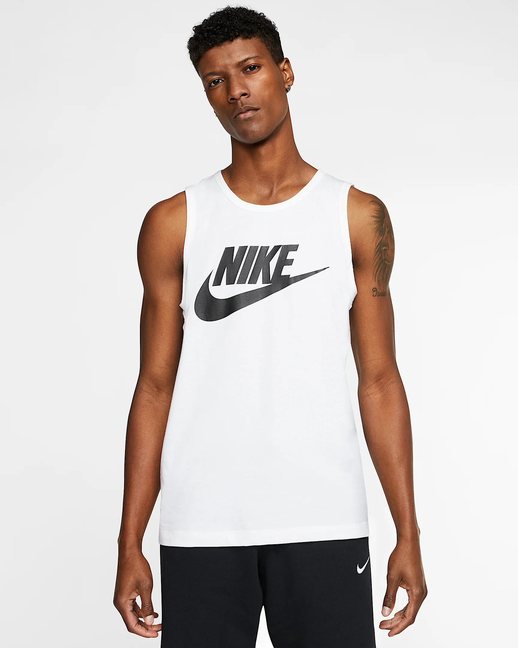 The Nike Sportswear Tank sets you up with a soft cotton jersey feel and bold branding at the chest for warm-weather comfort and style. Product Details - Standard fit for relaxed, easy feel - Fabric: 80-100% cotton/0-20% polyester - Machine wash - Imported - Note: Material percentages may vary depending on color. Check label for actual content. - Shown: White/Black - Style: AR4991-101 SIZE & FIT Standard fit: easy and traditional
