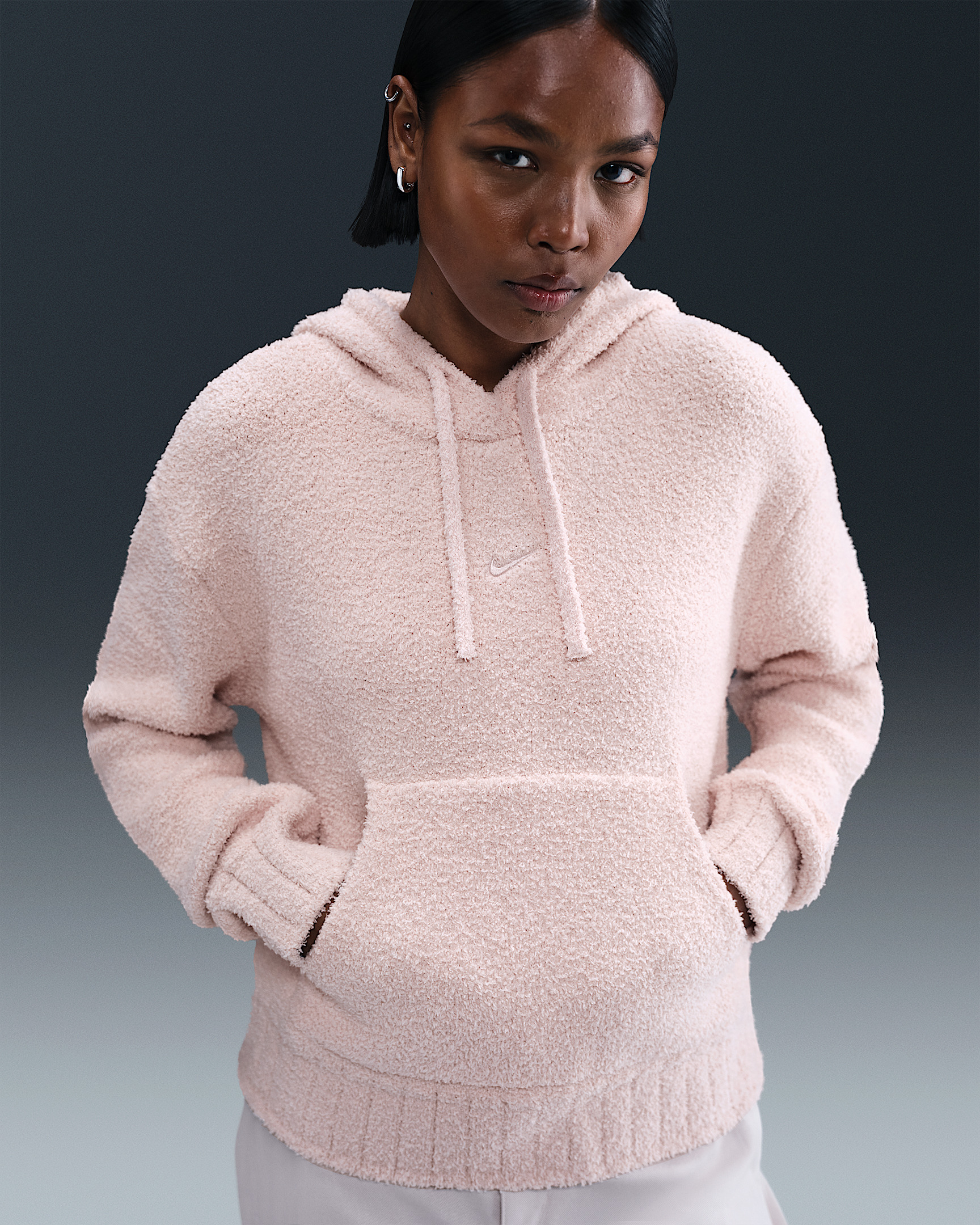 Luxurious comfort for every day—this hoodie is made from heavyweight boucle for an elevated and soft feel. Benefits - Cover yourself in luxurious boucle—our soft heavyweight knit that helps keep you warm and cozy. - Dropped shoulders and room through the body give you a loose fit. Product Details - 99% polyester/1% spandex - Drawstring - Self ribbing at hem and cuffs - Kangaroo pocket - Embroidered Swoosh logo - Machine wash - Imported - Shown: Silt Red/Silt Red - Style: HV2768-667 SIZE & FIT Model is wearing size S and is 5′7″170cm Loose fit: roomy and relaxed
