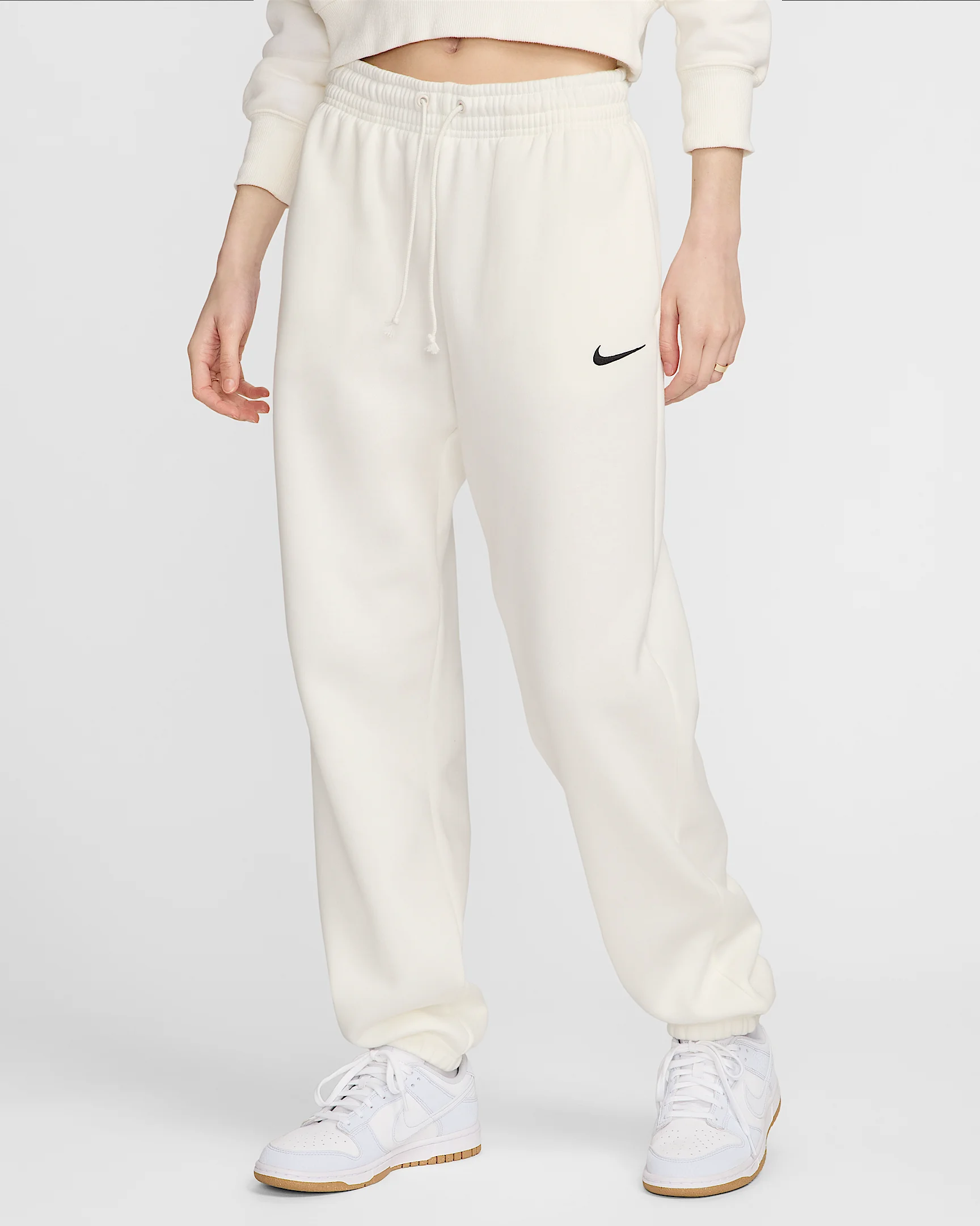Grounded in style, comfort and versatility, meet our take on luxury loungewear. Whether you're running errands or rewatching your favorite show, these midweight fleece sweats feel extra soft on the inside to help keep you cozy. The oversized fit is intended to sit high on your hips for comfort and a stay-put feel. Benefits - Encased elastic waistband and drawstrings ensure a fit that feels just right. - Pockets provide quick storage for keys, phone and cold hands. Product Details - 80% cotton/20% polyester - Embroidered Swoosh logo on left leg - Machine wash - Imported - Shown: Sail/Black - Style: FZ5996-133 SIZE & FIT Model is wearing size S and is 5′10″178cm Oversized fit: exaggerated and spacious Fl length: hits below ankle