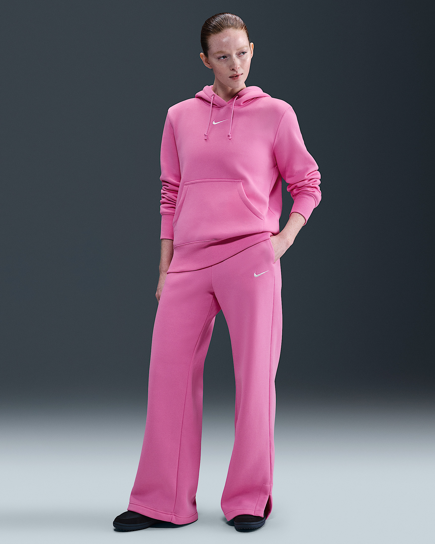 Made with midweight brushed fleece that feels extra soft on the inside and smooth on the outside, these wide-leg pants have an all-day cozy feel. Product Details - 80% cotton/20% polyester - Hand pockets - Side vents - Embroidered Swoosh logo on left thigh - Elastic waistband with drawcord - Machine wash - Imported - Shown: Playful Pink/Sail - Style: IH1011-675 SIZE & FIT Model is wearing size S and is 5′7″170cm Standard fit: easy and traditional Fl length: hits below ankle