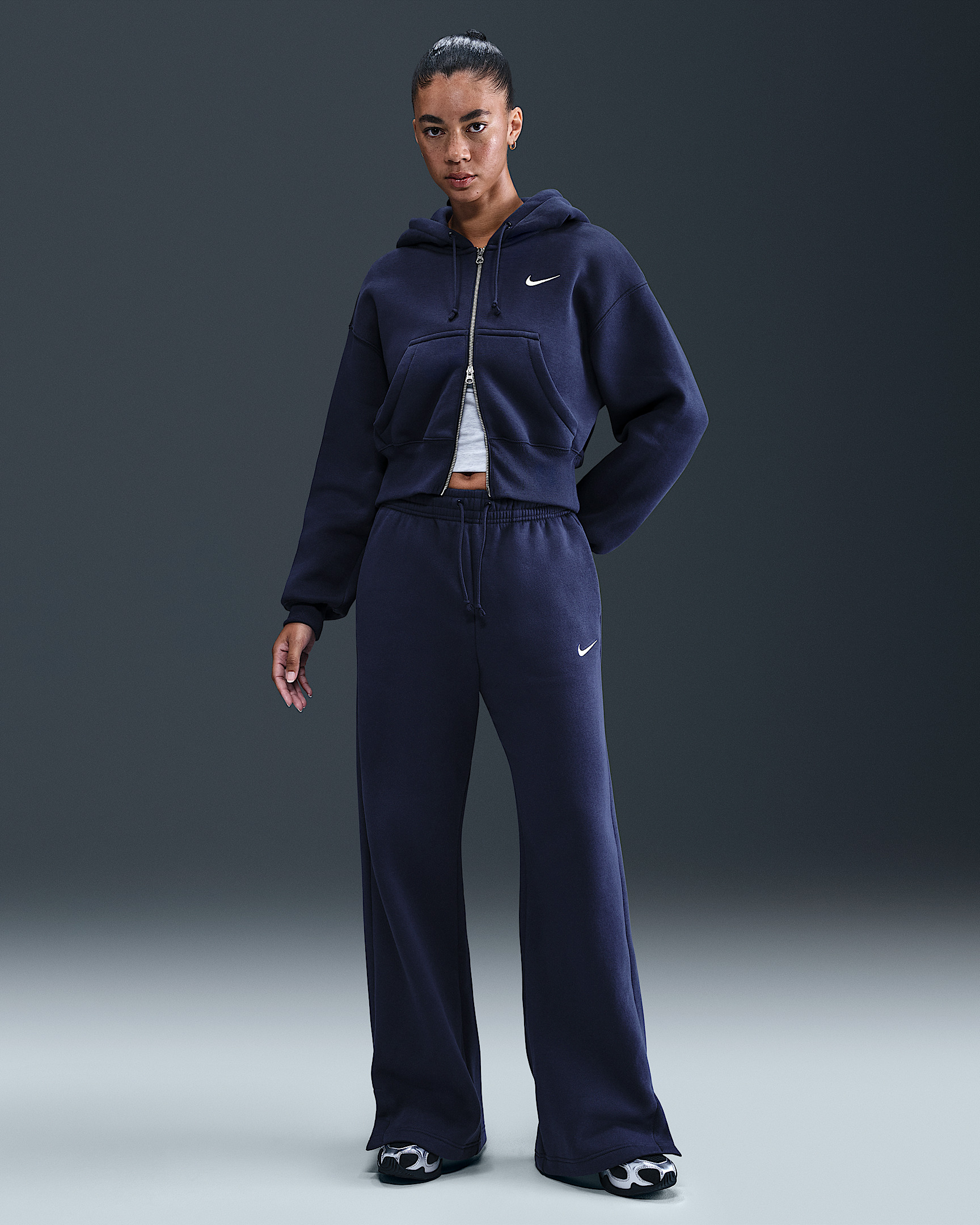 Made with midweight brushed fleece that feels extra soft on the inside and smooth on the outside, these wide-leg pants have an all-day cozy feel. Product Details - 80% cotton/20% polyester - Hand pockets - Side vents - Embroidered Swoosh logo on left thigh - Elastic waistband with drawcord - Machine wash - Imported - Shown: Midnight Navy/Sail - Style: IH1011-410 SIZE & FIT Model is wearing size S and is 5′9″175cm Standard fit: easy and traditional Fl length: hits below ankle