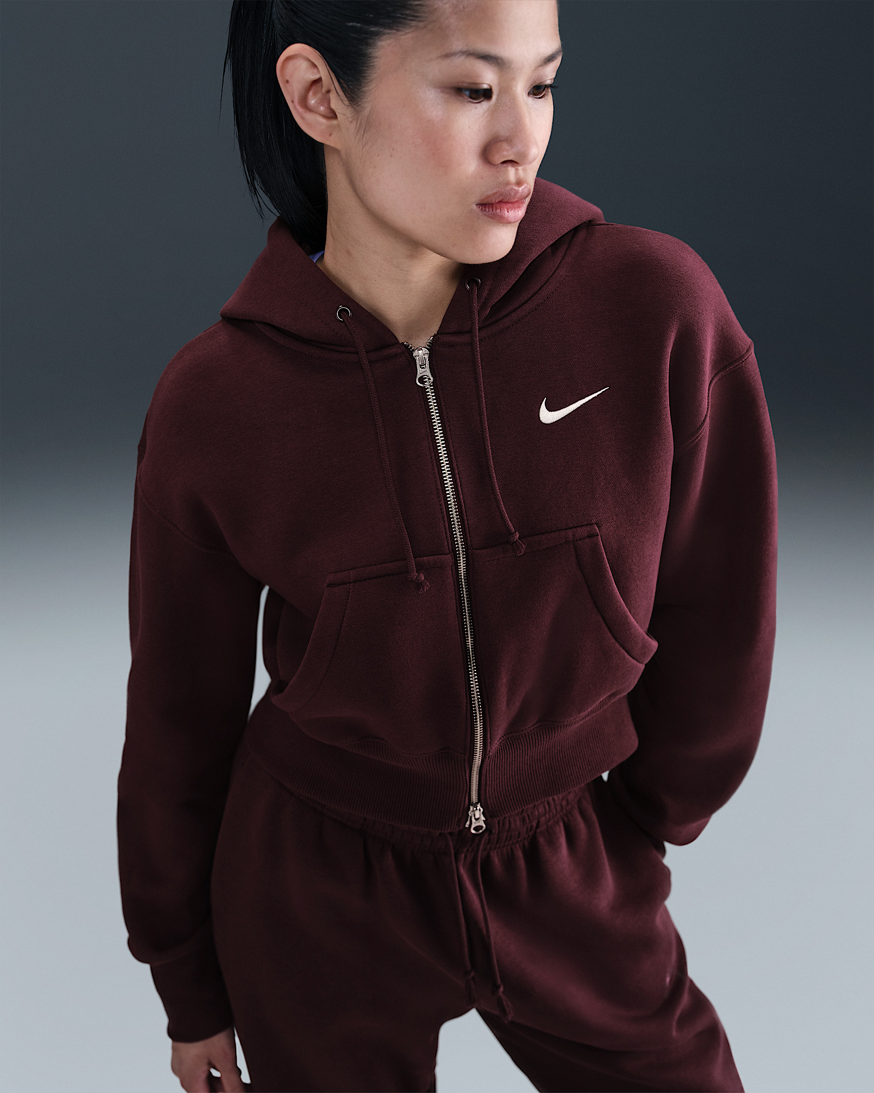 With a loose fit and extra-soft fleece, this hoodie has an all-day cozy feel. The two-way zipper gives you styling options. Product Details - Body/Hood Lining: 80% cotton/20% polyester. Rib: 97% cotton/3% spandex. - Ribbed cuffs and hem - Elongated drawcords - Front pockets - Embroidered Swoosh logo on left chest - Machine wash - Imported - Shown: Burgundy Crush/Sail - Style: HV2426-652 SIZE & FIT Model is wearing size S and is 5′10″178cm Loose fit: roomy and relaxed