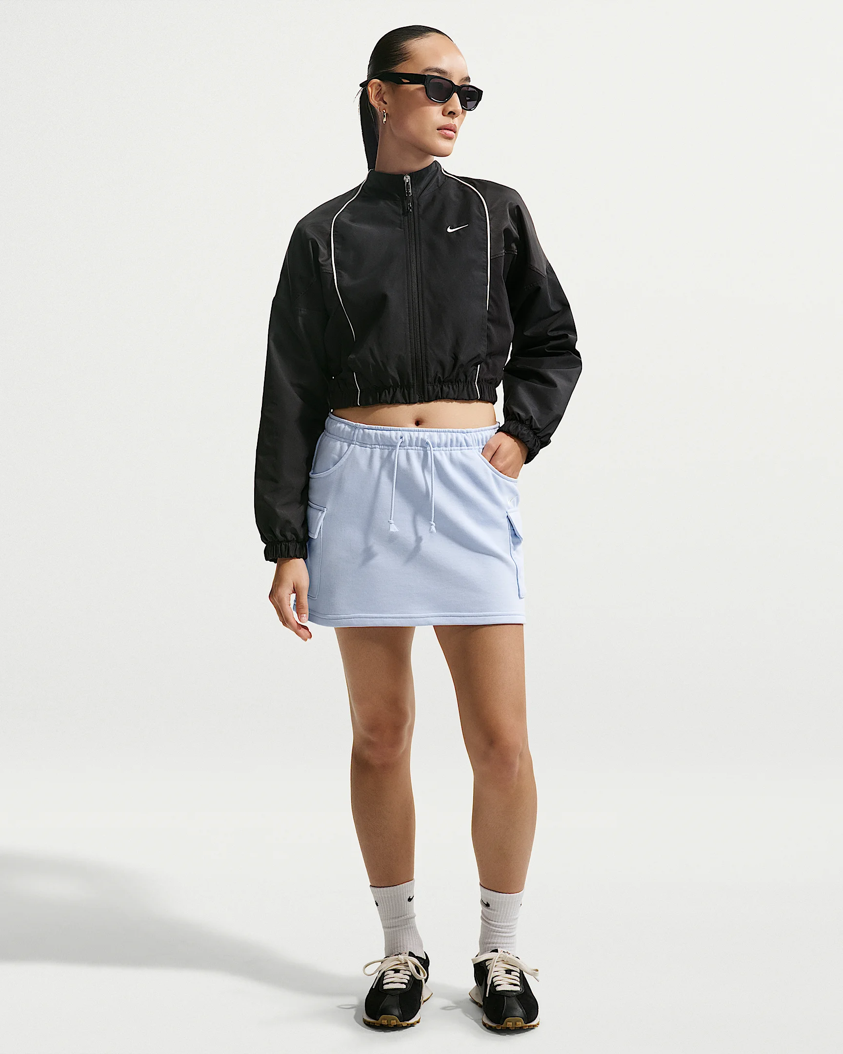 Cozy and casual, this miniskirt is crafted with midweight French terry fleece has soft loops on the inside and a light, drapey feel. It has a relaxed fit and lots of pockets. Product Details - Embroidered Swoosh logo - Above-knee length - Hand pockets - Cargo pockets - Elastic waistband with drawcord - Body: 80% cotton/20% polyester. Pocket bags: 100% cotton - Machine wash - Imported - Shown: Hydrogen Blue/Sail - Style: IU7872-407 SIZE & FIT Model is wearing size S and is 5′8″173cm Standard fit: easy and traditional