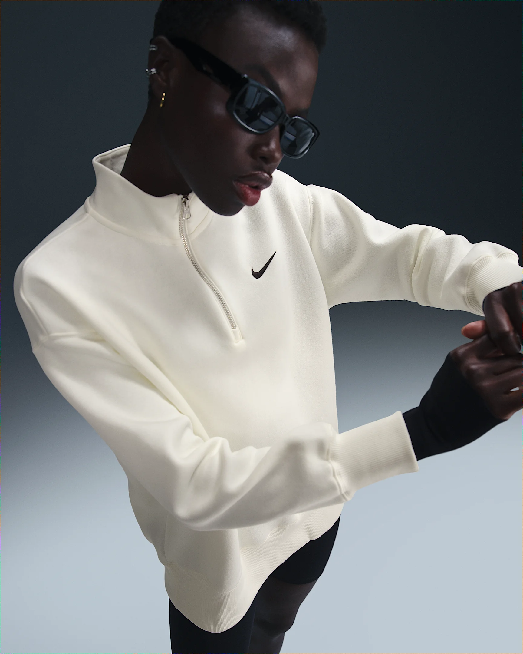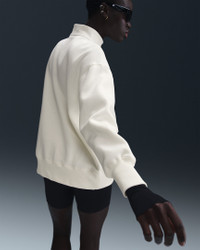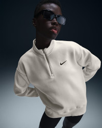 This cozy fleece 1/4-zip sweatshirt feels extra soft on the inside and smooth on the outside. Dropped shoulders and extra-wide ribbing enhance the oversized, extra-long look. Product Details - Body: 80% cotton/20% polyester. Rib: 97% cotton/3% spandex. - Embroidered Swoosh logo on left chest - Machine wash - Imported - Shown: Sail/Black - Style: HJ0931-133 SIZE & FIT Model is wearing size S and is 5′11″180cm Oversized fit: exaggerated and spacious