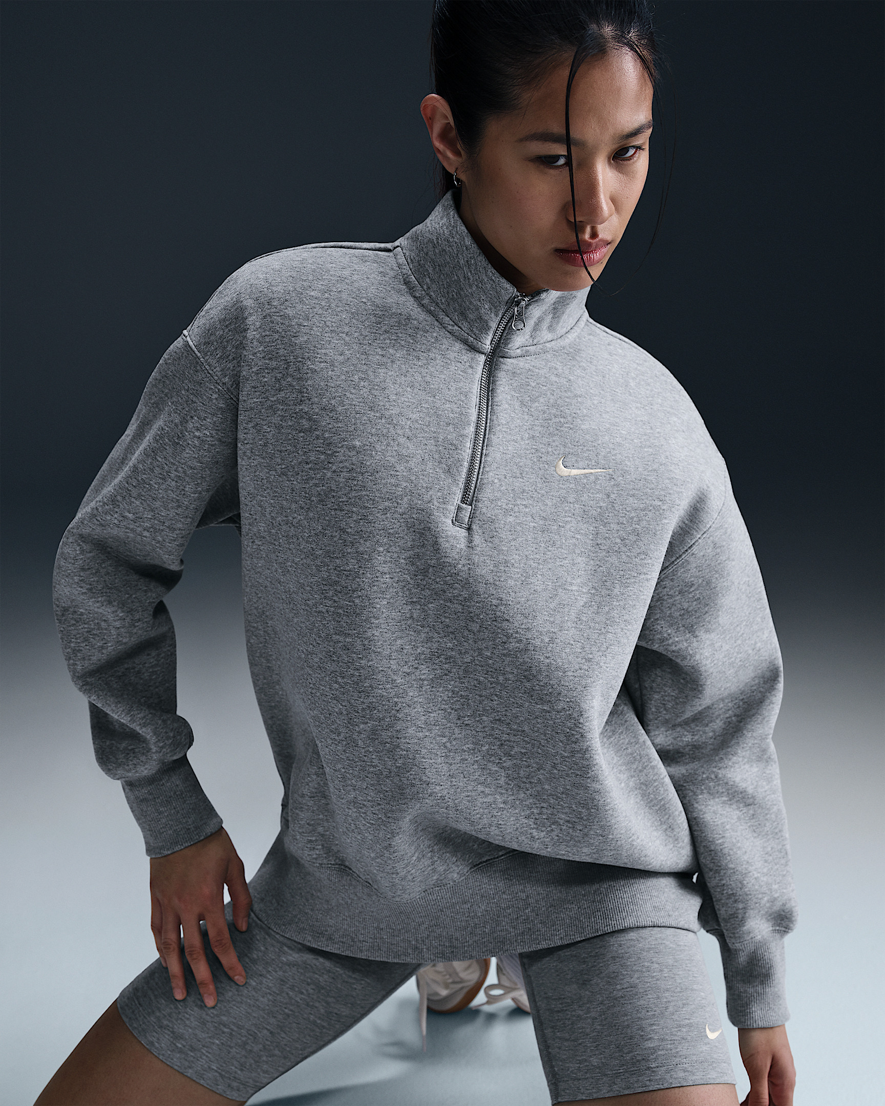 This cozy fleece 1/4-zip sweatshirt feels extra soft on the inside and smooth on the outside. Dropped shoulders and extra-wide ribbing enhance the oversized, extra-long look. Product Details - Body: 80% cotton/20% polyester. Rib: 97% cotton/3% spandex. - Embroidered Swoosh logo on left chest - Machine wash - Imported - Shown: Dark Grey Heather/Sail - Style: HJ0931-063 SIZE & FIT Model is wearing size S and is 5′10″178cm Oversized fit: exaggerated and spacious