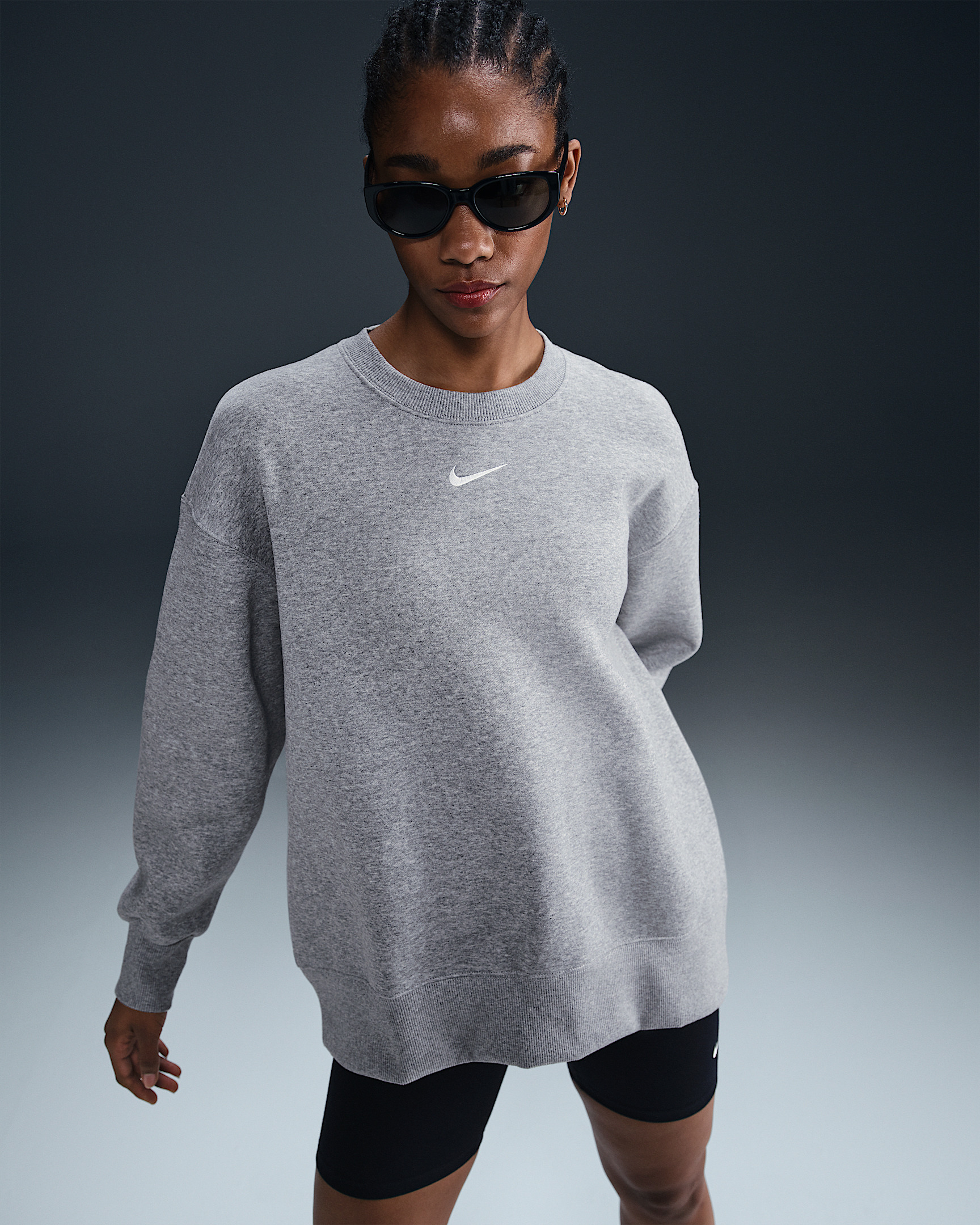 This cozy fleece sweatshirt feels extra soft on the inside and smooth on the outside. Dropped shoulders and extra-wide ribbing enhance the oversized look. Product Details - Body: 80% cotton/20% polyester. Rib: 97% cotton/3% spandex. - Embroidered Swoosh logo at center chest - Machine wash - Imported - Shown: Dark Grey Heather/Sail - Style: FZ4270-063 SIZE & FIT Model is wearing size S and is 5′8″173cm Oversized fit: exaggerated and spacious