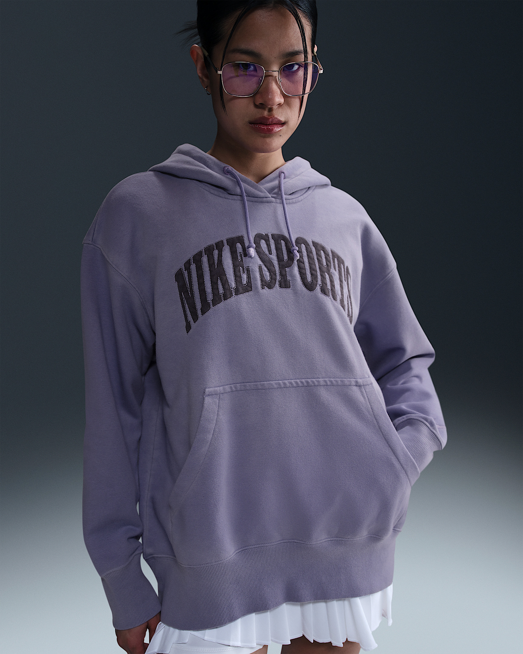 With unbrushed French terry and a vintage wash, this oversized sweatshirt has a breathable, broken-in feel. Product Details - Body/Hood lining: 88% cotton/12% polyester. Rib: 97% cotton/3% spandex. - Extra-wide ribbing - Elongated drawcords - Printed graphics with stitched outline - Embroidered Swoosh logo on left wrist - Embroidered drawcord opening - Machine wash - Imported - Shown: Dusty Amethyst - Style: HJ1235-527 SIZE & FIT Model is wearing size S and is 5′10″178cm Oversized fit: exaggerated and spacious