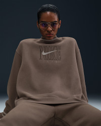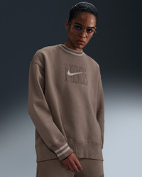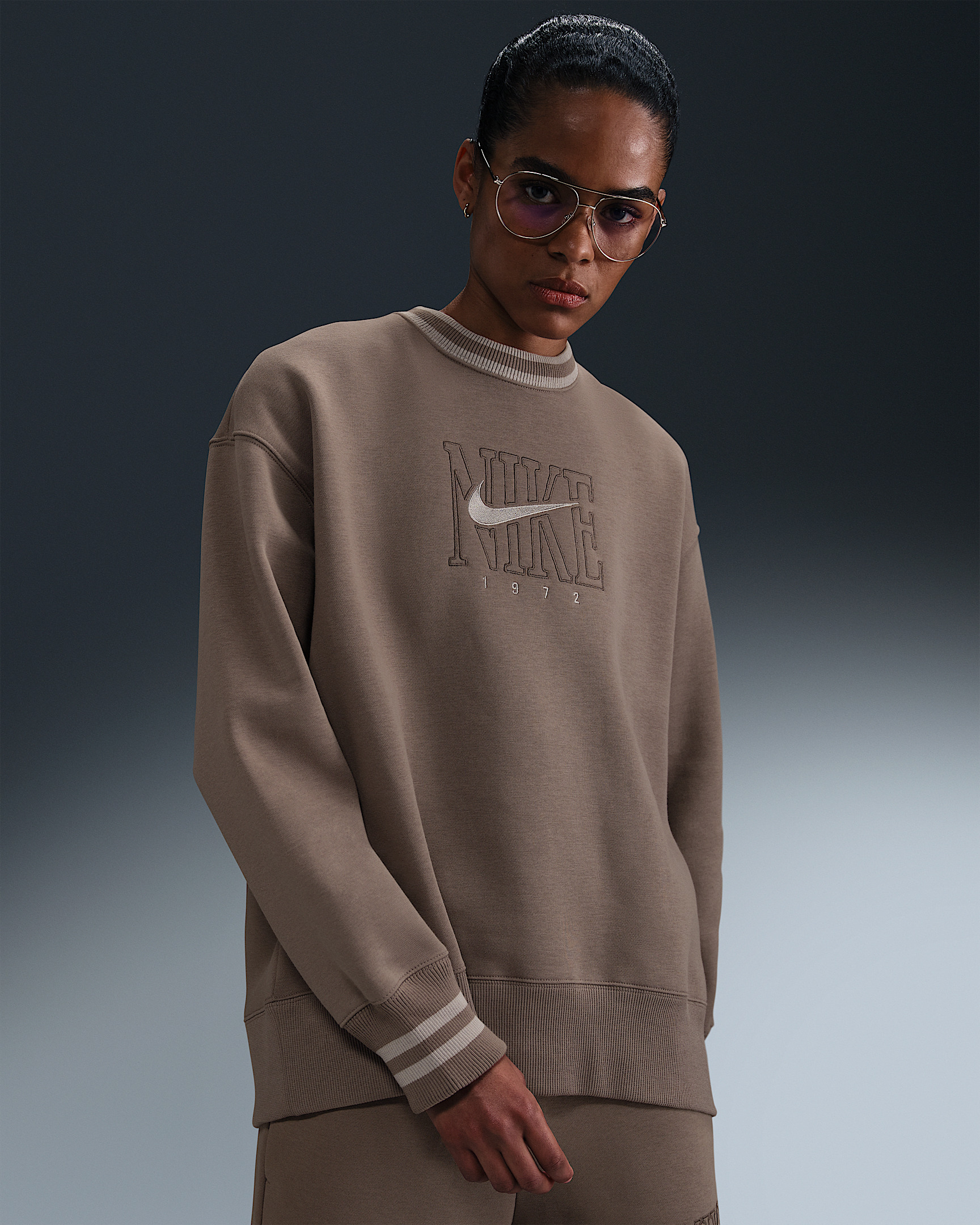 Past meets present in this crew-neck sweatshirt featuring an important year in Nike's history. Exaggerated ribbing emphasizes the oversized fit. Midweight fleece feels soft on the inside and smooth on the outside. Product Details - Body: 80% cotton/20% polyester. Rib: 97% cotton/3% spandex. - Two-color ribbed cuffs - Embroidered design on chest - Machine wash - Imported - Shown: Mink Brown - Style: HJ0949-233 SIZE & FIT Model is wearing size S and is 5′10″178cm Oversized fit: exaggerated and spacious