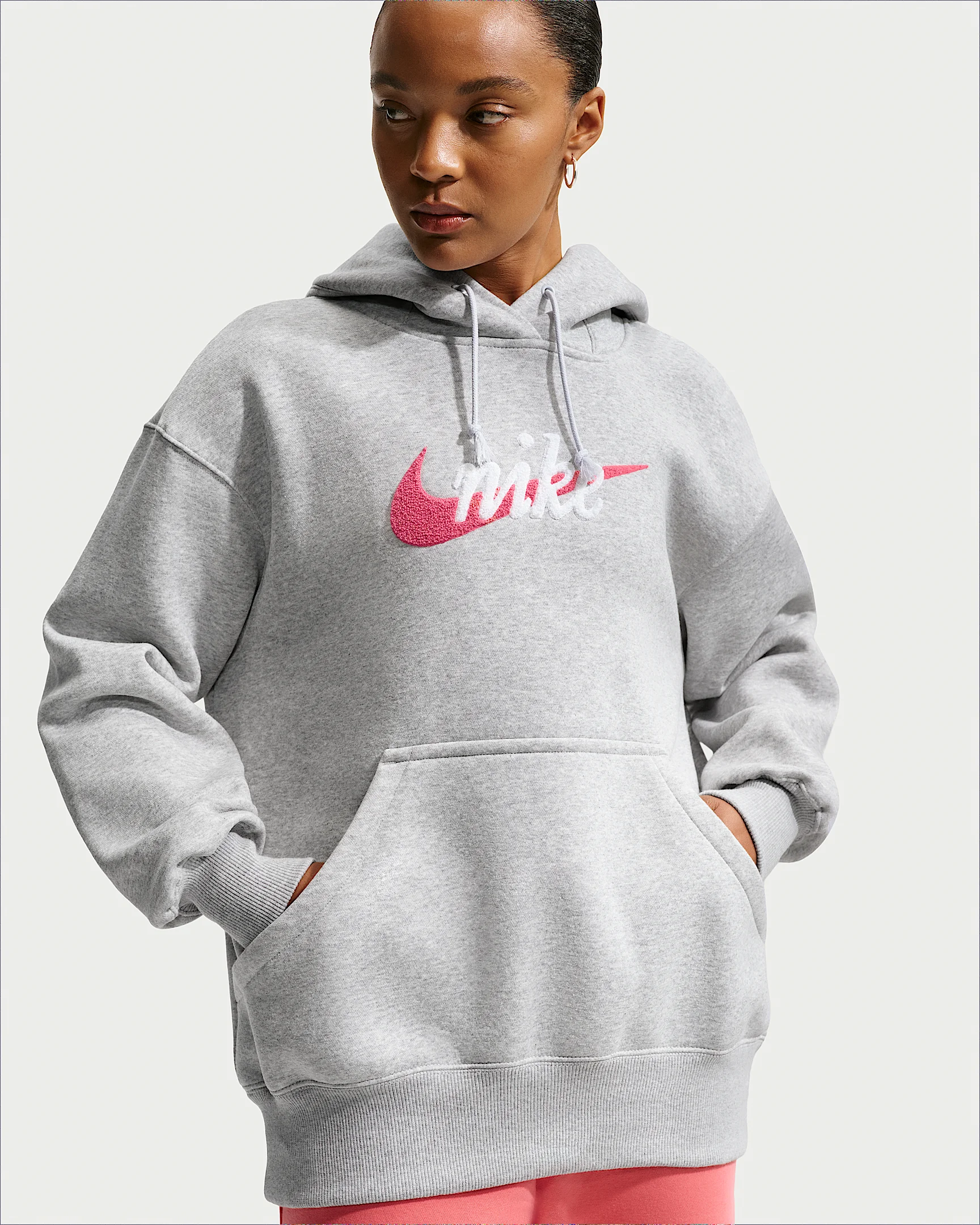 This hoodie is crafted with midweight brushed fleece that's extra soft on the inside and smooth on the outside. It has dropped shoulders, an extra roomy fit and is elevated with a textured logo for a look that's perfectly slouchy yet put-together. Product Details - Ribbed hem and cuffs - Body: 80% cotton/20% polyester. Hood lining: 100% cotton. - Machine wash - Imported - Shown: Pure Platinum/Heather/Sea Coral - Style: IM9643-043 SIZE & FIT Model is wearing size S and is 5′7″170cm Oversized fit: exaggerated and spacious