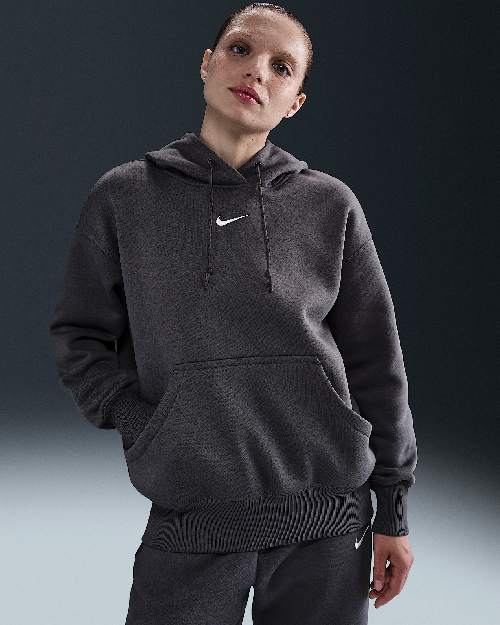 Grounded in style, comfort and versatility, meet our take on luxury loungewear. This classic hoodie helps you stay cozy all day long, thanks to midweight fleece that feels soft yet structured. Plus, exaggerated details (like taller ribbing and oversized fit) give you a trend-right look. Benefits - Our midweight brushed fleece feels extra soft on the inside and smooth on the outside, helping you stay cozy while keeping its structured shape. - Dropped shoulders and roomy sleeves provide a relaxed, oversized feel. Product Details - Drawcord hood - Elongated ribbing - Oversized pocket - Embroidered Swoosh logo - Body: 80% cotton/20% polyester. Hood lining: 100% cotton. - Machine wash - Imported - Shown: Thunder Grey/Sail - Style: DQ5860-036 SIZE & FIT Model is wearing size S and is 5′10″178cm Oversized fit: exaggerated and spacious Fits large; we recommend ordering a size down