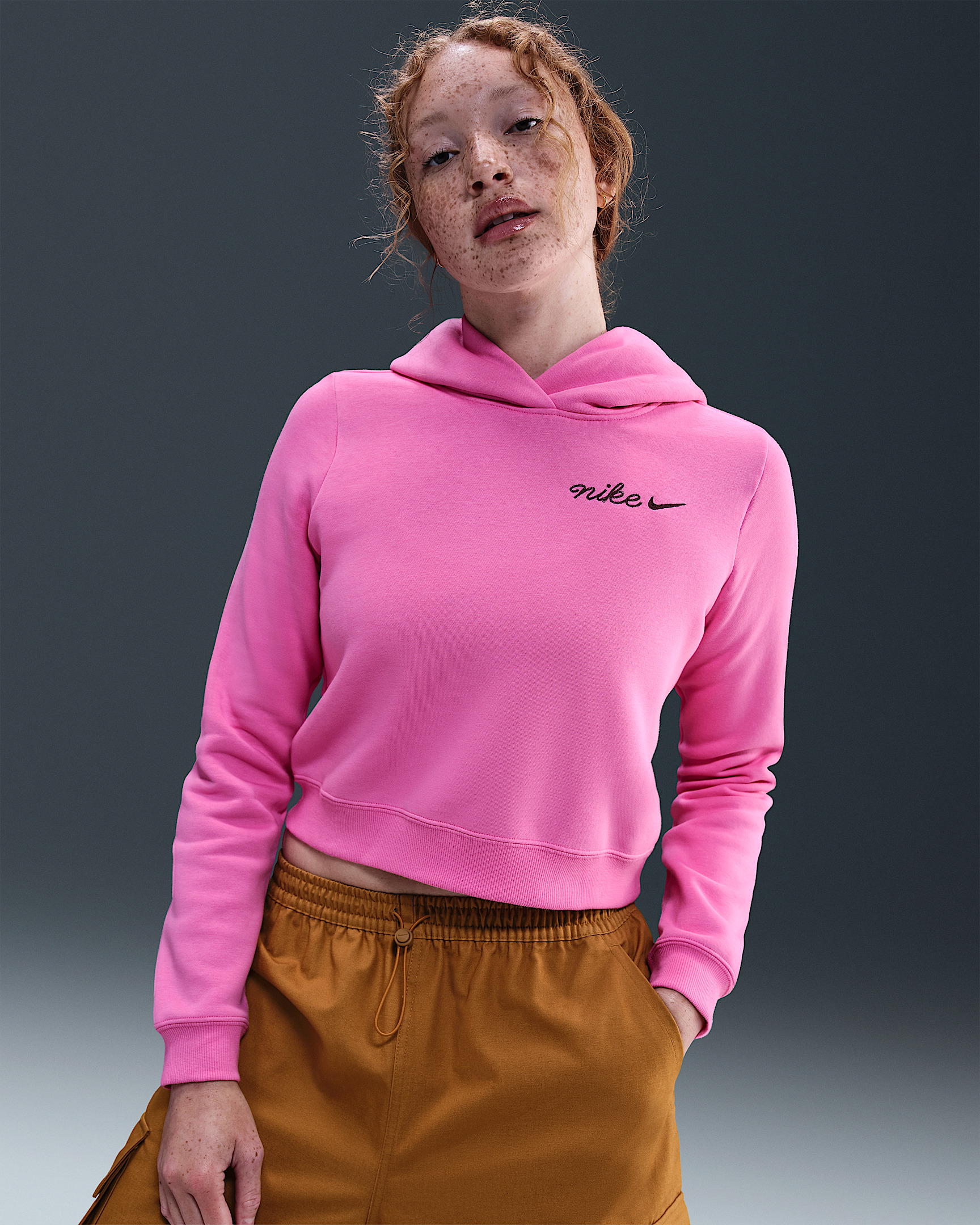 Made from midweight brushed fleece, this hoodie feels soft and cozy. Cursive lettering and a cropped, fitted silhouette elevate this classic style. Product Details - Body/Hood Lining: 80% cotton/20% polyester. Rib: 96% cotton/4% spandex. - Embroidered design - Ribbed cuffs and hem - Machine wash - Imported - Shown: Playful Pink - Style: IM7494-675 SIZE & FIT Model is wearing size S and is 5′1″155cm Sm fit: sleek and tailored