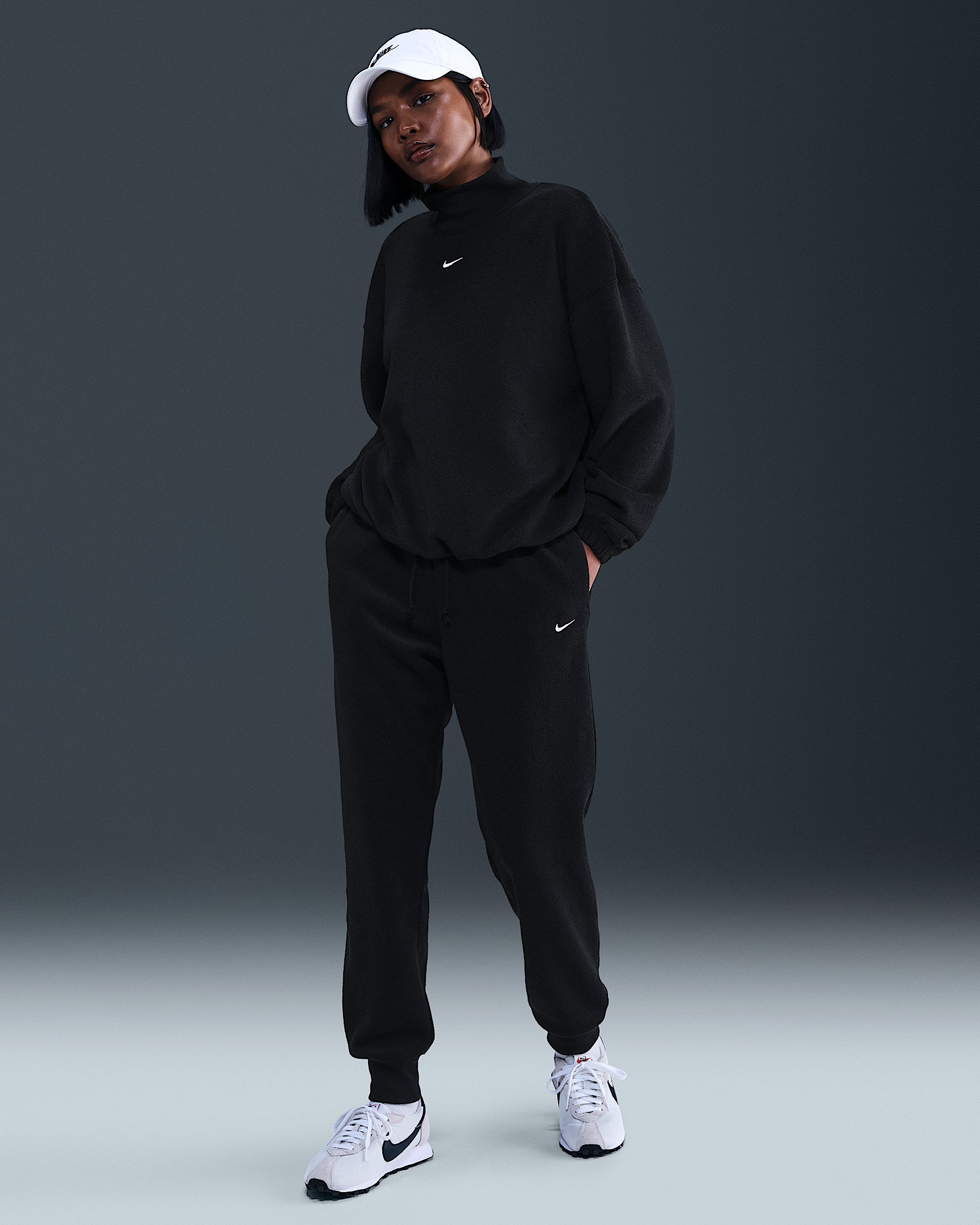 These pants are made with textured midweight fleece that helps keep you feeling extra cozy. A tapered leg adds some structure to your look. Product Details - Body: 73% polyester/27% rayon. Pocket bags: 100% cotton. - Elastic waistband with drawcord - Side slit pockets - Embroidered Swoosh logo on left hip - Machine wash - Imported - Shown: Black/Sail - Style: HQ7644-011 SIZE & FIT Model is wearing size S and is 5′7″170cm Standard fit: easy and traditional Fl length: hits below ankle