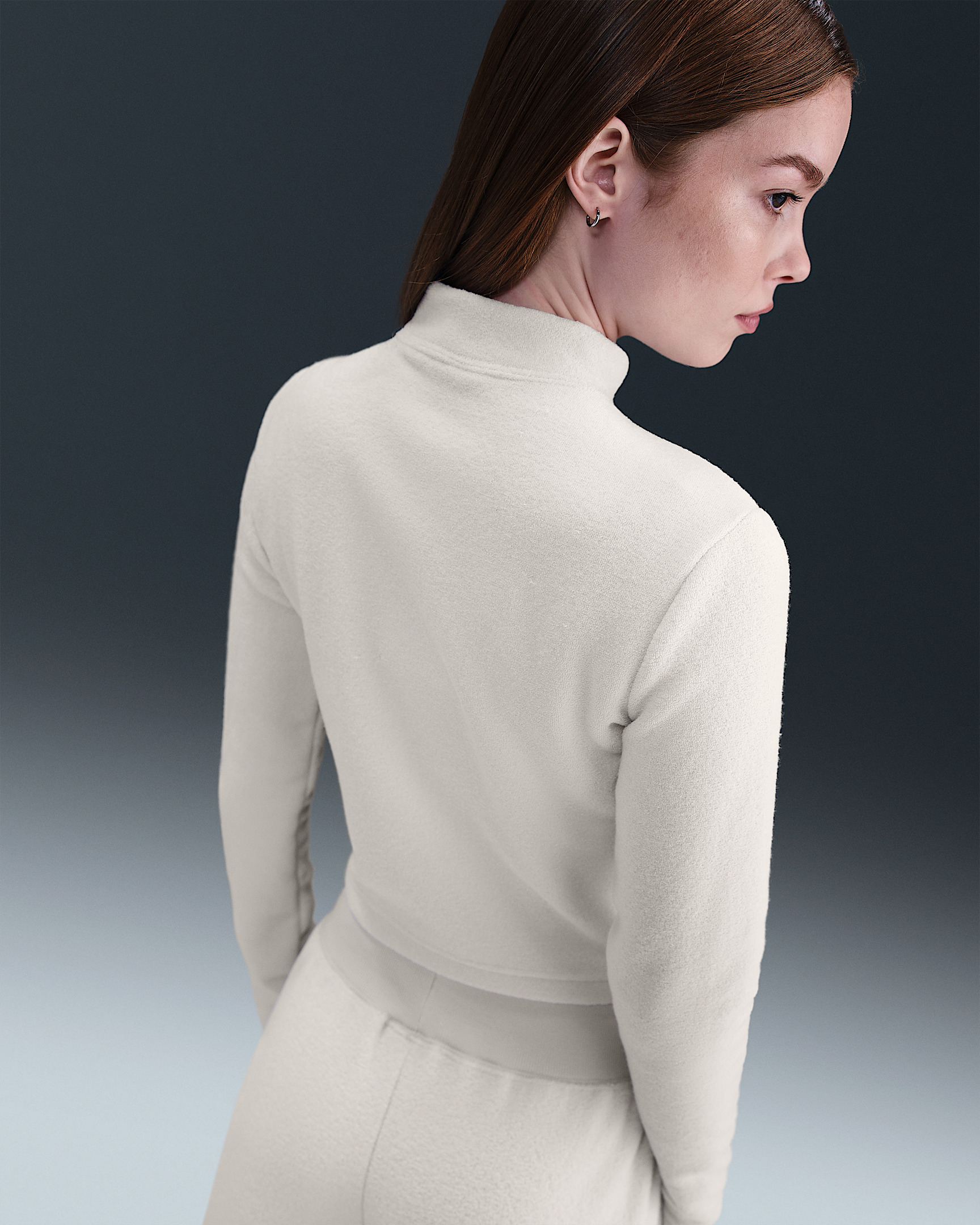 Structured and cozy? Yes, please. This top’s fabric feels plush on the outside and fuzzy on the inside, elevating fleece in a polished silhouette. Product Details - 73% polyester/27% rayon - Mock-neck collar - Embroidered Swoosh logo on left chest - 1/2-length zipper with thin metal zipper pull - Machine wash - Imported - Shown: Light Bone/Sail - Style: FV8028-072 SIZE & FIT Sm fit: sleek and tailored