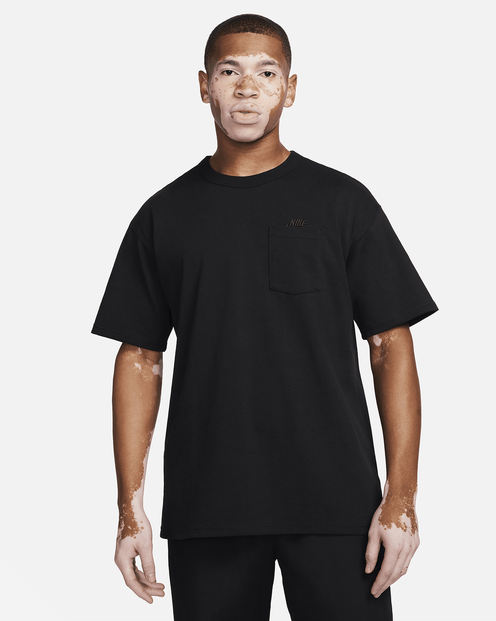 The Nike Sportswear Premium Essentials T-Shirt is made with heavyweight cotton jersey and a loose fit for a soft, sturdy feel you can enjoy for years to come. The embroidered Futura is partially covered by the pocket on this clean, comfortable tee. This product is made with at least 75% organic cotton fibers. Benefits - Dropped shoulders, longer sleeves and a roomy fit through the body and hips give the Max 90 silhouette a relaxed and casual look. - It has a stiff drape and dry hand for a smooth yet sturdy feel. Product Details - Loose fit for a roomy feel - Embroidered Futura logo - Woven label - 100% Cotton - Machine wash - Imported - Shown: Black - Style: DQ9295-011 SIZE & FIT Model is wearing size M and is 5′11″180cm Loose fit: roomy and relaxed