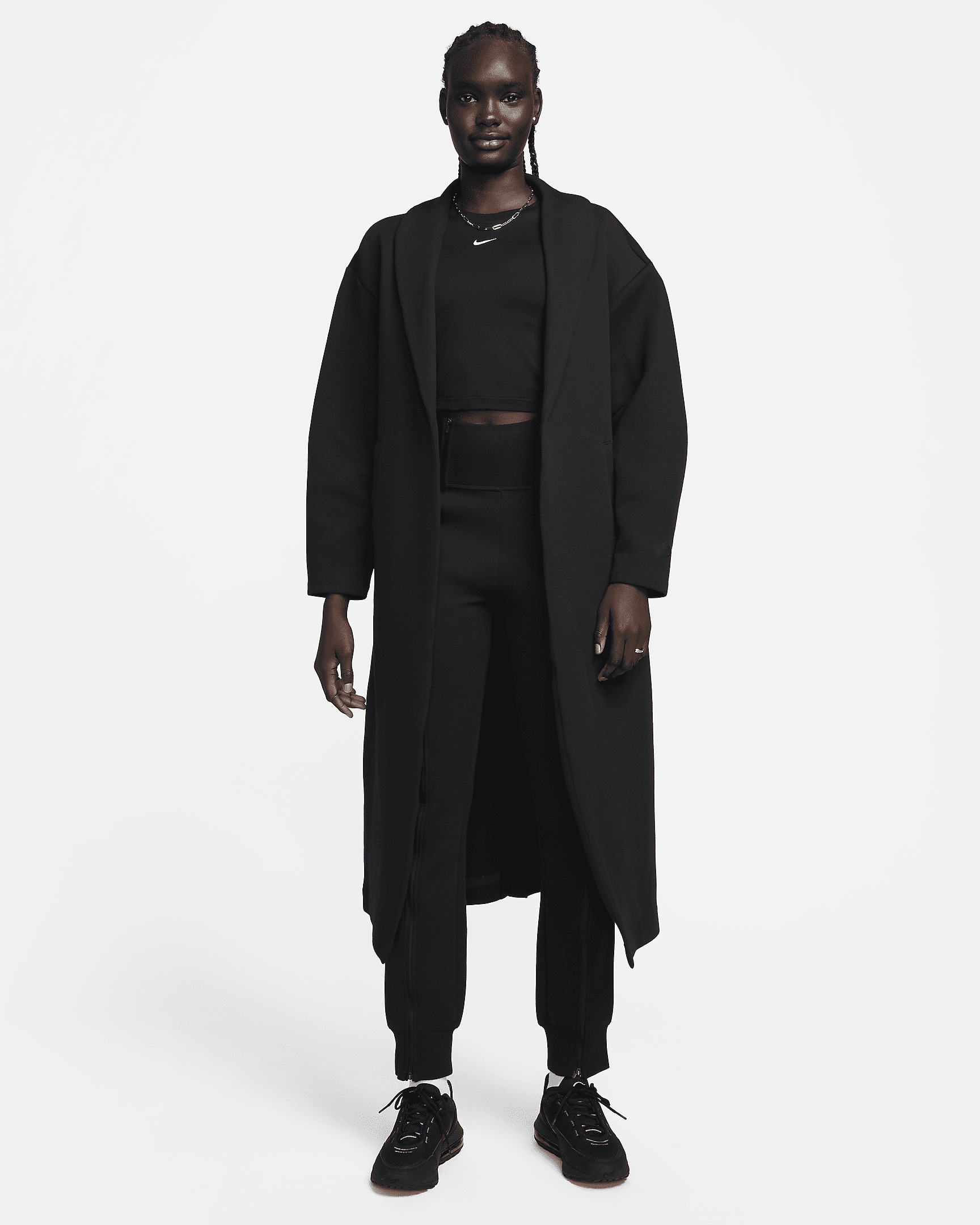 Layer up with low-profile warmth in this duster jacket. Our premium, smooth-on-both-sides fleece feels warmer and softer than ever, while keeping the same lightweight build you love. Dropped shoulders and extra room through the sleeves gives you a relaxed vibe and make it perfect for layering over any outfit. Benefits - Slit at center back and darts at elbows make for ease of movement. - Pockets provide quick storage for keys, phone and cold hands. Product Details - 53% cotton/47% polyester - Printed Nike Futura logo at left sleeve hem - Machine wash - Imported - Shown: Black/Black - Style: FQ2602-010 SIZE & FIT Oversized fit: exaggerated and spacious