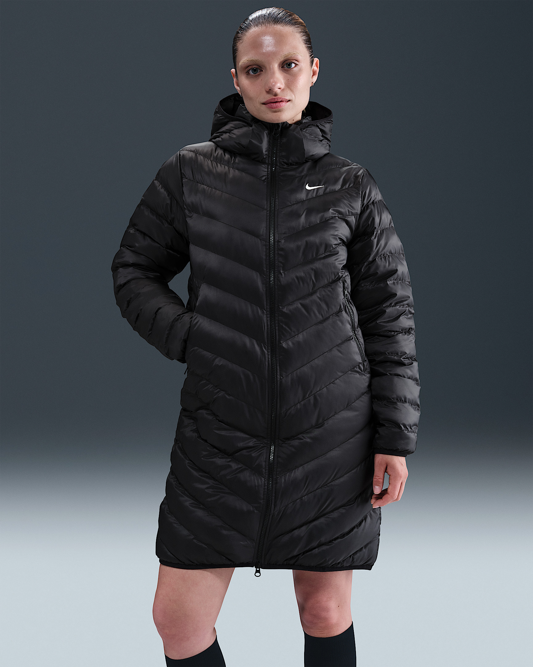 Bundle up in this parka designed with angled baffles that connect to Nike's historic Windrunner design. Therma-FIT technology uses your body's natural heat to help keep you warm. For versatility, a 2-way zipper and removable hood let you customize your look. More Benefits - Style: Warm, full-length parka - Materials: Recycled polyester and down-alternative fill - Construction: Synthetic insulation and iconic Windrunner chevron baffles - Storage: Zippered hand pockets and interior pocket - Trim: 2-way zipper closure - Perks: Removable hood Product Details - Body/Lining/Fill: 100% polyester - Embroidered Swoosh logo - Embroidered Therma-FIT logo - Machine wash - Imported - Shown: Black/Sail - Style: HV2460-010 SIZE & FIT Model is wearing size S and is 5′10″178cm Standard fit: easy and traditional