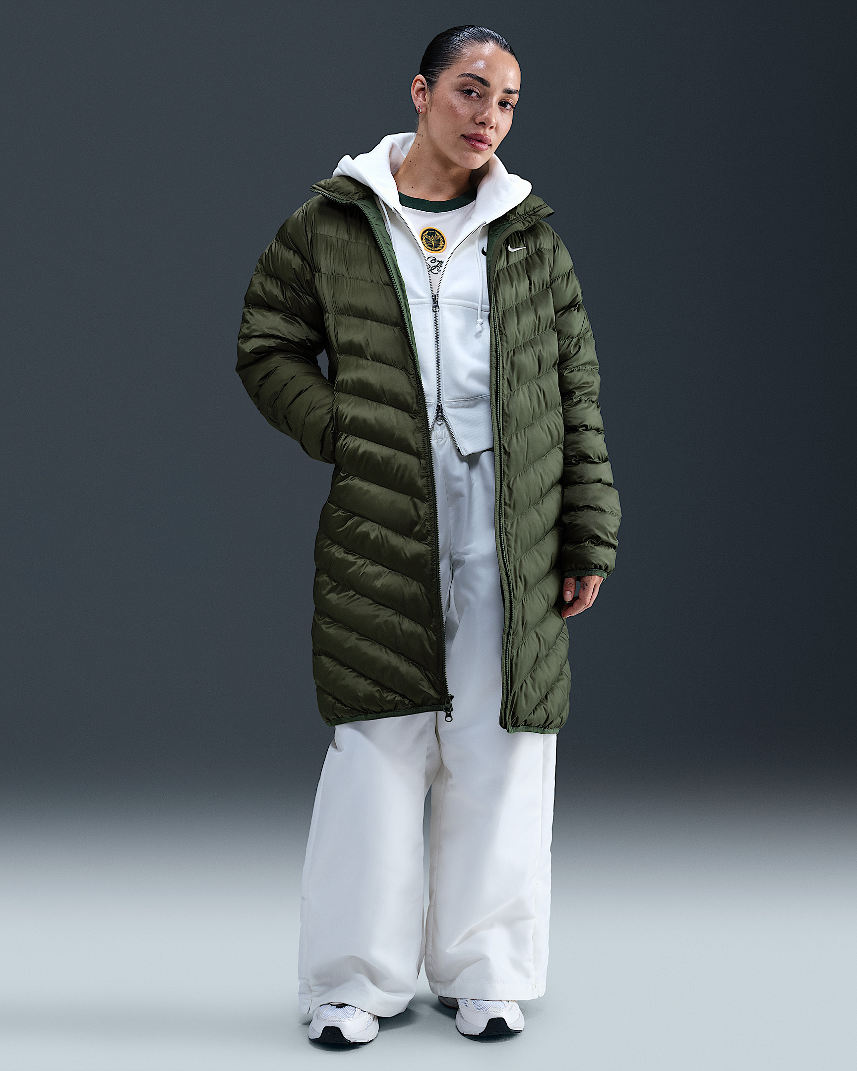 Bundle up in this parka designed with angled baffles that connect to Nike's historic Windrunner design. Therma-FIT technology uses your body's natural heat to help keep you warm. For versatility, a 2-way zipper and removable hood let you customize your look. More Benefits - Style: Warm, full-length parka - Materials: Recycled polyester and down-alternative fill - Construction: Synthetic insulation and iconic Windrunner chevron baffles - Storage: Zippered hand pockets and interior pocket - Trim: 2-way zipper closure - Perks: Removable hood Product Details - Body/Lining/Fill: 100% polyester - Embroidered Swoosh logo - Embroidered Therma-FIT logo - Machine wash - Imported - Shown: Medium Olive/Sail - Style: HV2460-222 SIZE & FIT Model is wearing size S and is 5′7″170cm Standard fit: easy and traditional