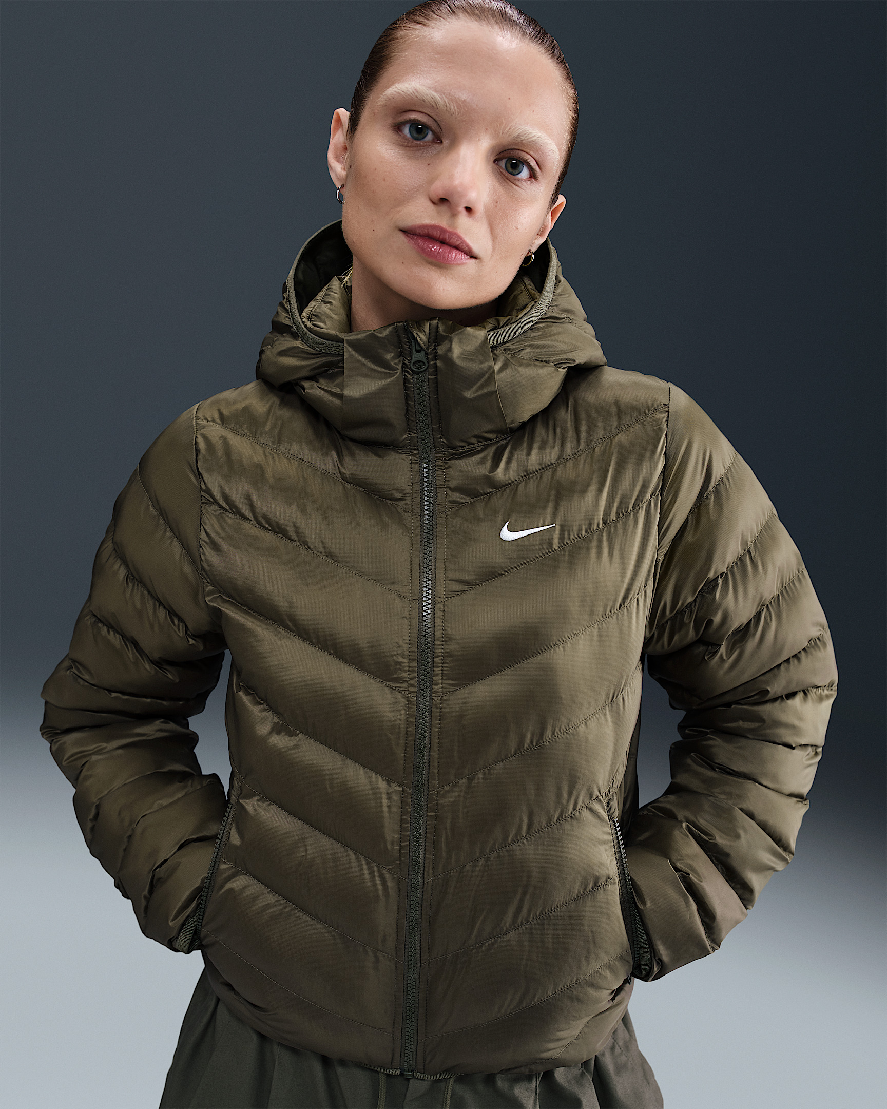 Bundle up in this water-resistant puffer. Therma-FIT technology uses your body's natural heat to help keep you warm. For versatility, a removable hood lets you customize your look. More Benefits - Style: Warm, hip-length jacket - Materials: Recycled polyester and lightweight down-alternative fill - Construction: Synthetic insulation and iconic Windrunner chevron baffles - Storage: Zippered hand pockets and snap-closure interior pocket - Perks: Removable hood Product Details - Body/Lining/Fill: 100% polyester - Embroidered Swoosh logo - Embroidered Therma-FIT logo - Machine wash - Imported - Shown: Medium Olive/Sail - Style: HV2457-222 SIZE & FIT Model is wearing size S and is 5′10″178cm Standard fit: easy and traditional