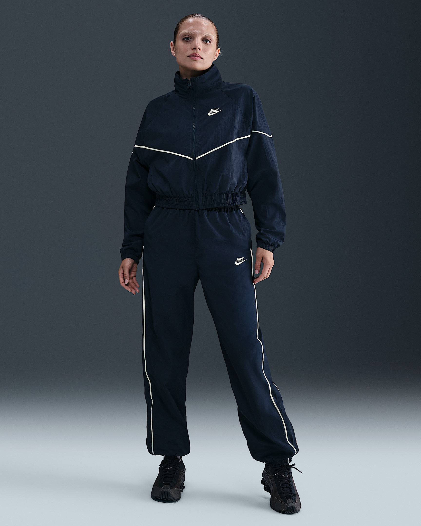 A classic silhouette, these high-waisted track pants are roomy through the legs for a loose fit. Lightweight and water-repellent taffeta has a crisp and smooth feel. Product Details - Body: 100% nylon. Lining: 100% polyester - Pockets - Elastic waistband with drawcord - Elastic at cuffs - Embroidered Swoosh logo - Machine wash - Imported - Shown: Midnight Navy/Sail/Sail - Style: IM8031-410 SIZE & FIT Model is wearing size S and is 5′10″178cm Loose fit: roomy and relaxed Fl length: hits below ankle