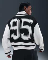 A sport-inspired classic, this cardigan pairs a varsity look with a cozy feel. Chunky knit gives you volume and drape while feeling soft and comfortable against your skin. Benefits - 2-way zipper gives you extra versatility when styling. - Dropped shoulders and extra room through the body give you an oversized fit. Product Details - 98% acrylic/1% spandex/1% polyester - Striped ribbing at neck, hem and cuffs - Oversized fit - Embroidered Swoosh logo - Hand wash - Imported - Shown: Black/Sail/Vast Grey/Sail - Style: HV2494-010 SIZE & FIT Model is wearing size S and is 5′7″170cm Oversized fit: exaggerated and spacious