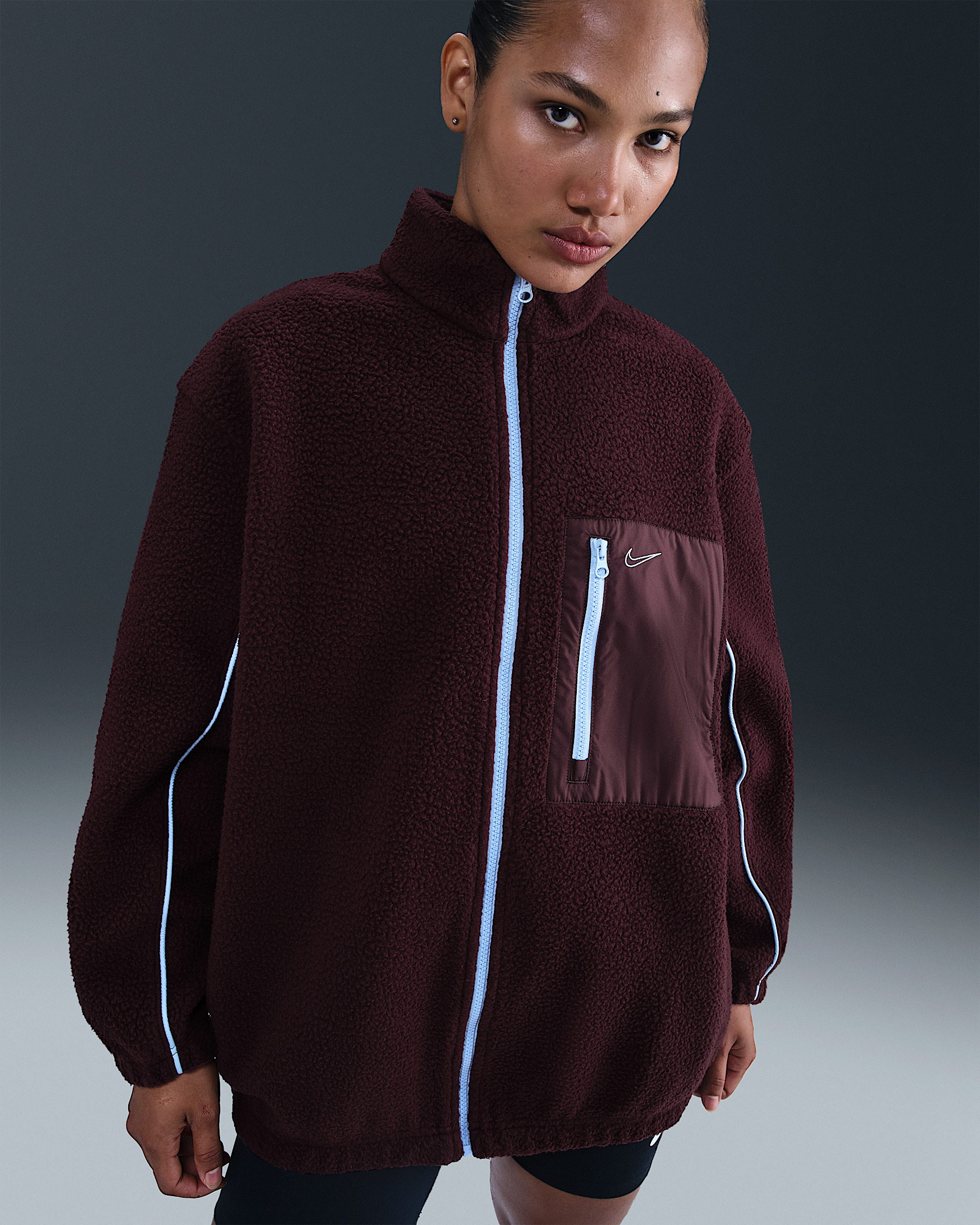Cozy up in this oversized jacket. Lofted fleece helps manage your body's natural heat to help keep you warm in cold conditions—and it feels super soft. Product Details - 100% polyester - Side-seam Pockets - Piping on sleeves - Zippered chest pocket - Elastic at hem and cuffs - Zippered closure - Machine wash - Imported - Shown: Burgundy Crush/Burgundy Crush/Celestine Blue/Celestine Blue - Style: IM7484-652 SIZE & FIT Model is wearing size S and is 5′8″171cm Oversized fit: exaggerated and spacious